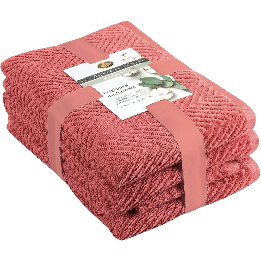 Современный ассортимент махровых изделий из хлопка с «елочкой» и элегантной велюровой отделкой. Набор состоит из 2 полотенец для гостей, 2 полотенец для рук и 2 банных полотенец и доступен в 7 однотонных цветах. Таким образом, каждый сможет выбрать подходящий цвет. Махровые полотенца можно стирать при 60°C и они подходят для сушки в сушильной машине.