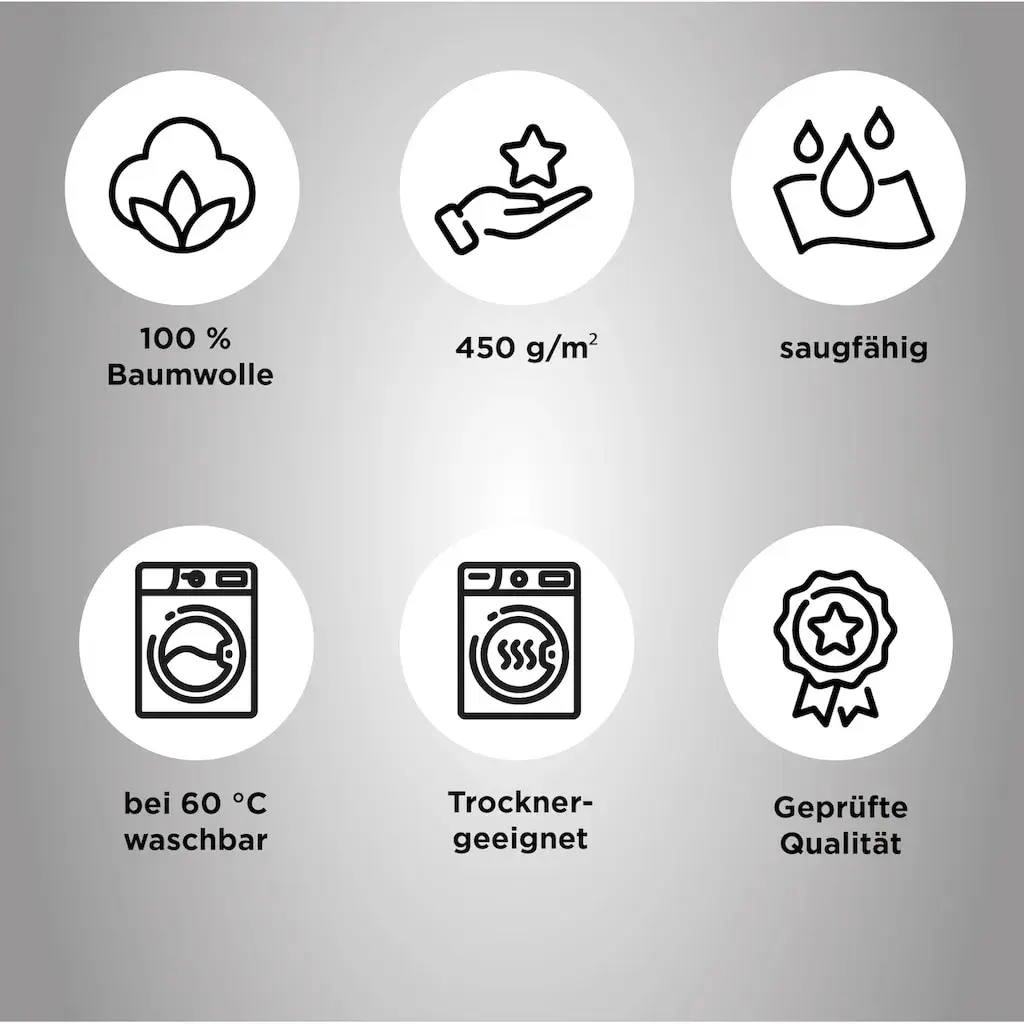 ВЫСОКОКАЧЕСТВЕННАЯ КЛАССИКА - полотенца из махровой ткани и соответствующий коврик для ванной из 100% хлопка высочайшего качества для особенно приятных ощущений на коже и под ногами, РАЗЛИЧНЫЕ РАЗМЕРЫ - подходящий продукт на любой случай: рукавица для мытья, полотенце для гостей, полотенце для рук, банное полотенце, особенно большое полотенце для лежания и соответствующий коврик для ванной, ПОДХОДЯЩЕ ДЛЯ ЕЖЕДНЕВНОГО ИСПОЛЬЗОВАНИЯ И ЛЕГКО В УХОДЕ - идеально для ежедневного использования, отлично впитывает влагу и быстро сохнет, можно стирать при 60°C и сушить в сушильной машине, ВЕЧНАЯ ЭЛЕГАНТНОСТЬ - лаконичный дизайн прекрасно смотрится как в классических, так и в современных ванных комнатах, ШИРОКИЙ АССОРТИМЕНТ - множество цветов от классических до современных, махровые полотенца плотностью около 450 г/м², коврик для ванной имеет плотность около 450 г/м²