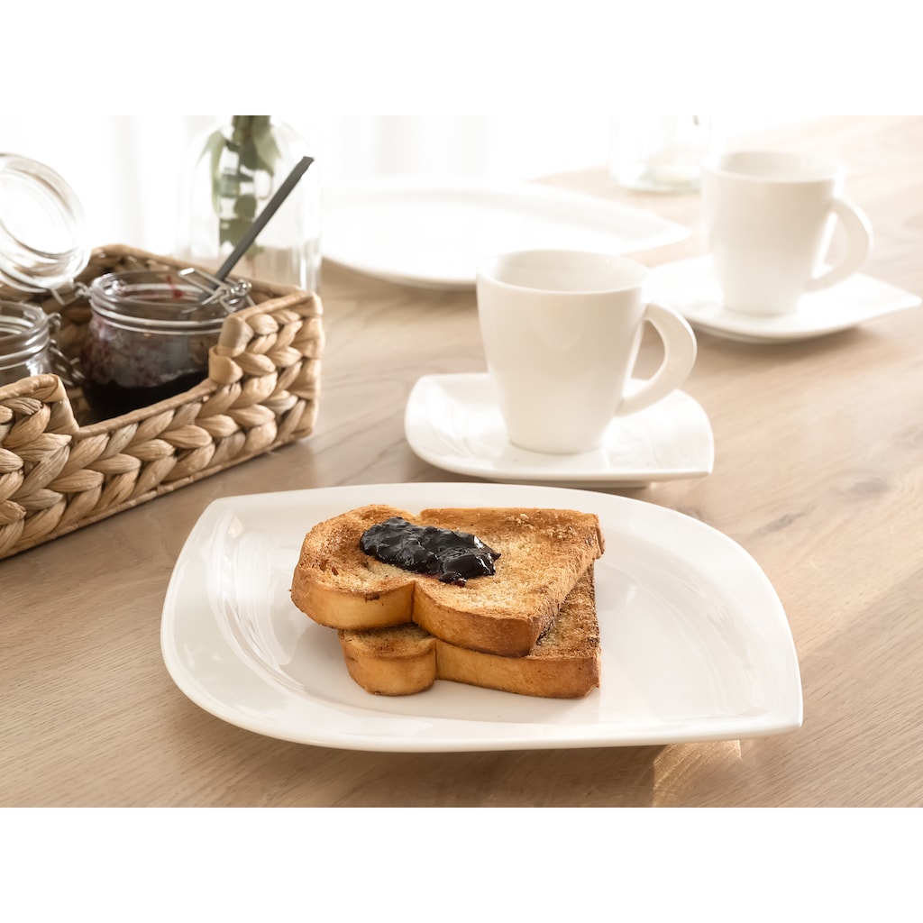 Сервис представлен в новой форме с листовидным характером, при этом ручка чашки повторяет форму тарелки. В целом кремово-белый набор выглядит изящно и элегантно и отлично подходит как для праздничного стола, так и для повседневного использования. Мельбурн: посуда с немного необычным дизайном!