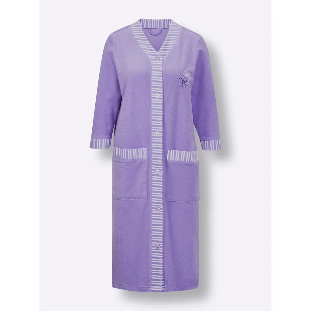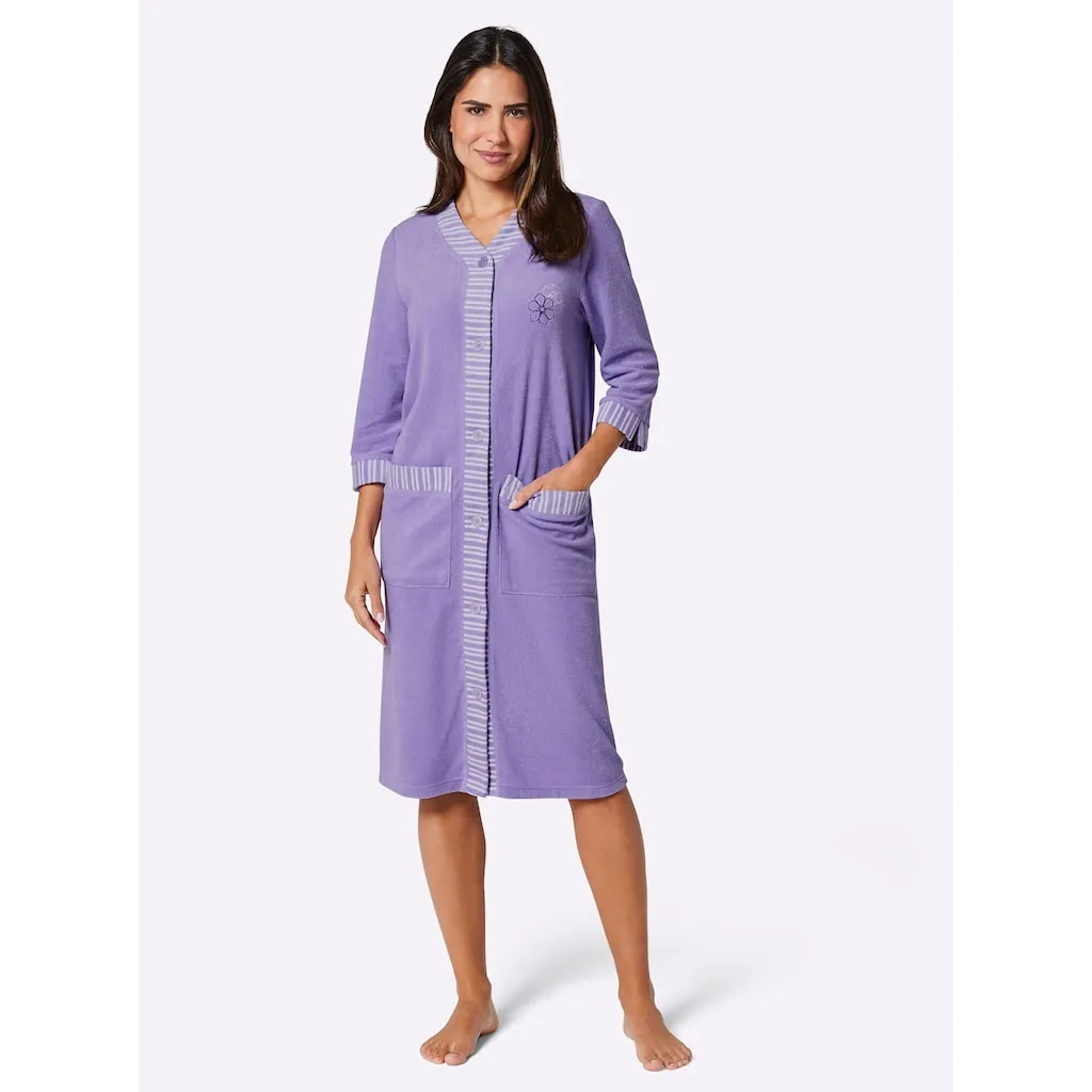 Контрастный банный халат от feel good из приятного на ощупь легкого флиса. Декоративная вышивка на груди. С V-образным вырезом, сплошной планкой с пуговицами и рукавами 3/4 с разрезами. 2 накладных кармана. Поддерживает инициативу Cotton made in Africa. 80% хлопок, 20% полиэстер.