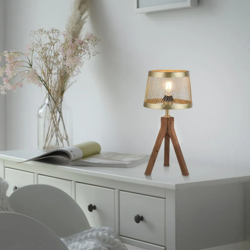 Настольная лампа FREDERIK идеально подходит для создания уютного освещения в жилом помещении. Лампа сочетает в себе абажур цвета матовой латуни с каркасом на трех ножках из дерева. Благодаря прозрачности абажура особенно эффектно смотрится лампа с нитью накаливания. Декоративный дизайн настольной лампы с деревянной триножной подставкой особенно гармонично вписывается в интерьер в скандинавском стиле. В качестве источника света можно использовать любую лампу с цоколем E27 и максимальной мощностью 60 Вт. Диаметр лампы составляет 20 см, а высота - 46 см.