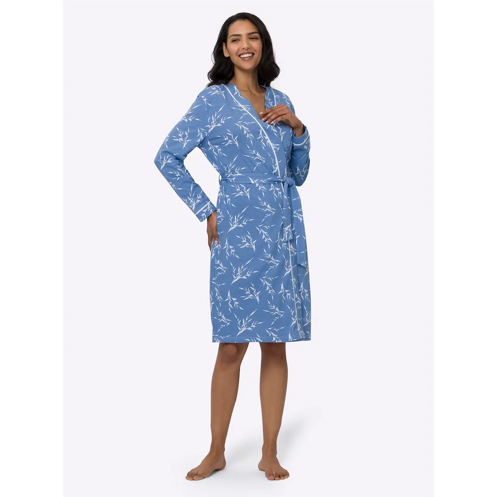 Халат из однотонного джерси с гармоничным цветочным узором по всему изделию - идеальный спутник для приятного начала дня. С контрастной отделкой вдоль V-образного выреза и переднего края, а также на манжетах длинных рукавов. С петлями для пояса и печатным поясом. 100% хлопок.