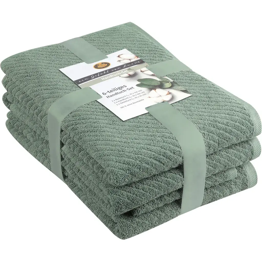 Наименование товара Количество деталей: 6 шт. Тип набора: комплект Цвет Название цвета: нефритовый Материал Вид материала: махровая ткань Состав материала: верхний Материал: 100% хлопок Плотность: 480 г/м² Материал: махровая ткань Информация Уход: стирка в машине при 60°C, подходит для сушки в сушильной машине Цветовые указания: Обратите внимание, что цвета на вашем мониторе могут отличаться от оригинальных оттенков. Детали продукта Информация о бренде: W. F. Gözze Frottierweberei GmbH Информация о наборе: 2 больших полотенца 70x140 см; 2 гостевых полотенца 30x50 см; 2 полотенца для рук 50x100 см Тип полотенца: набор полотенец Полезная информация Сертификация OEKO-TEX Standard 100, номер сертификата: коллективный сертификат 09.0.67812