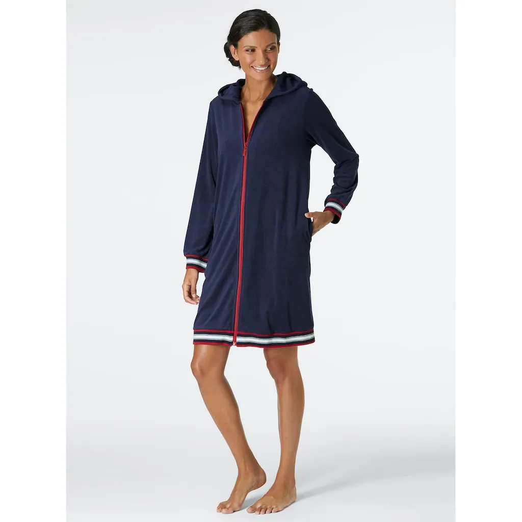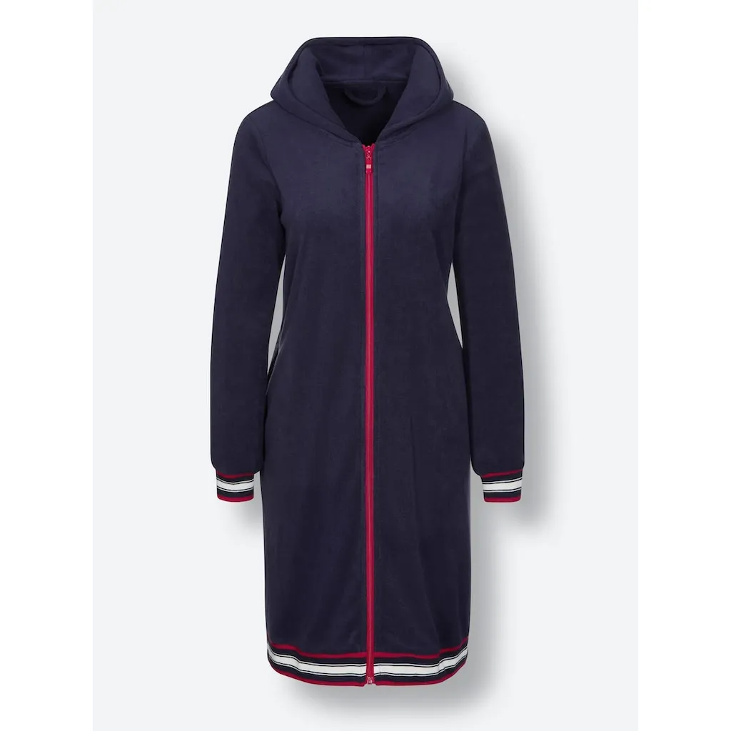 От feel good! Халат из легкого фротте с капюшоном на подкладке и контрастной молнией по всей длине. 2 боковых кармана. Эластичные манжеты и подол в полоску из рип-пике. 80% хлопок, 20% полиэстер.