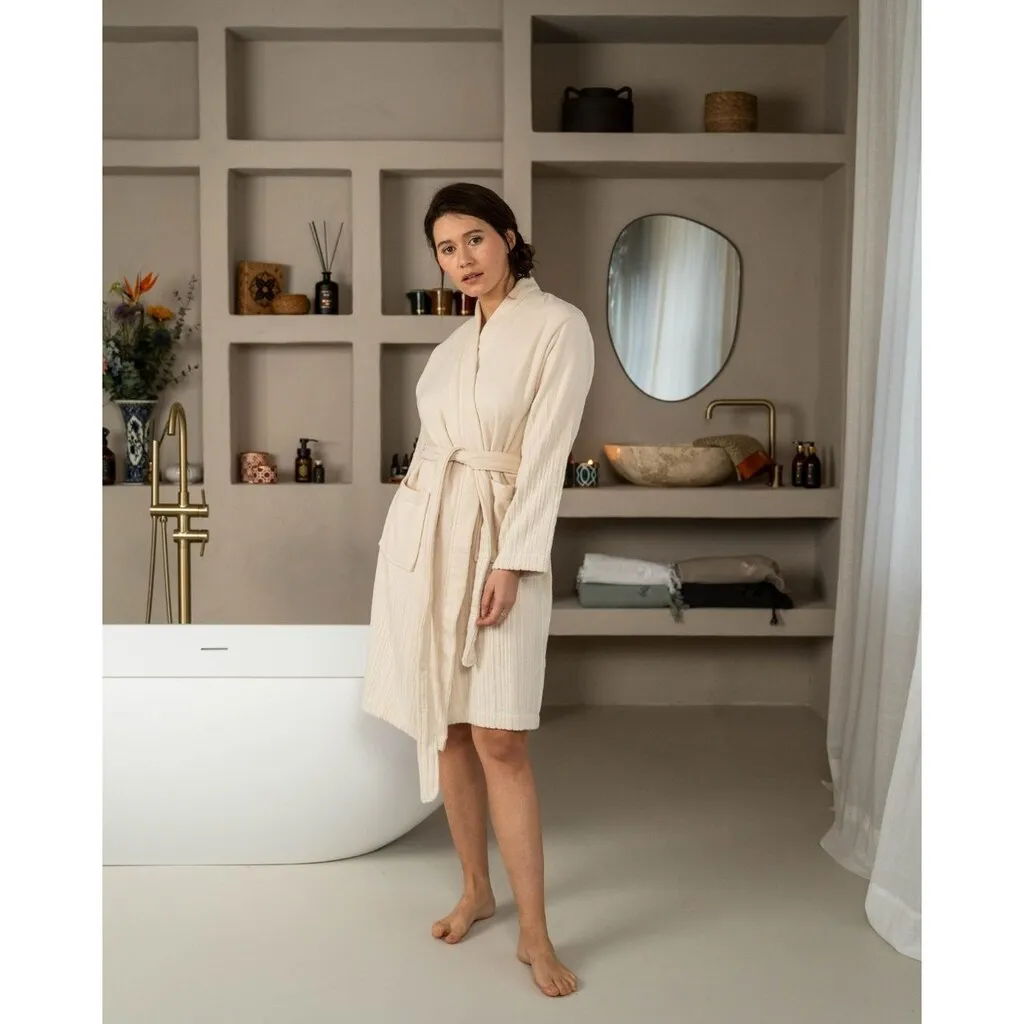 100% хлопок, сертифицированный OCS, вышитый дизайнИщете уникальный халат, который выделяется среди обычных? Тогда Meguro - это именно тот халат, который вам нужен! На нижнем крае халата и на рукавах есть красивый вышитый узор, который придает ему особый шарм.Meguro изготовлен из 100% хлопка и благодаря высокому качеству (400 г/м²) ощущается очень приятно. Доступен в зеленом и песочном цвете.