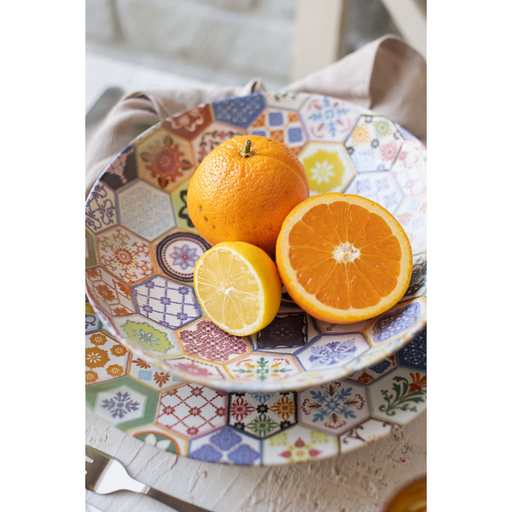 Этот 12-предметный набор тарелок с португальским плиточным декором включает 4 плоские обеденные тарелки (Ø 27 см), 4 глубокие тарелки (Ø 22 см, объем 900 мл) и 4 десертные тарелки (Ø 21 см). Набор посуды сочетает плоские обеденные тарелки, тарелки для завтрака и суповые тарелки в один комплект, подходящий для любого случая. Современная круглая форма Coupe обеденной посуды предлагает достаточно пространства для ваших кулинарных шедевров. Сервиз был изготовлен с душой в Португалии из прочного каменного фарфора, подходящего для мытья в посудомоечной машине, использования в духовке и микроволновой печи (высококачественный вид керамики). Вся коллекция посуды "Amarante" от традиционного бренда MÄSER так же проста в уходе, как фарфор, и легко моется вручную или в посудомоечной машине.