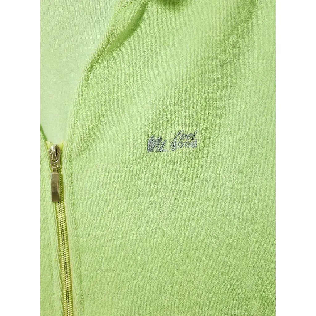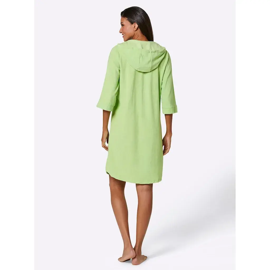 Халат из легкой махровой ткани. Изысканно выполнен с декоративной вышивкой на груди и шов с складками под грудью. Капюшон с кулиской и поясом. Молния. Рукава 3/4. 80% хлопок, 20% полиэстер.