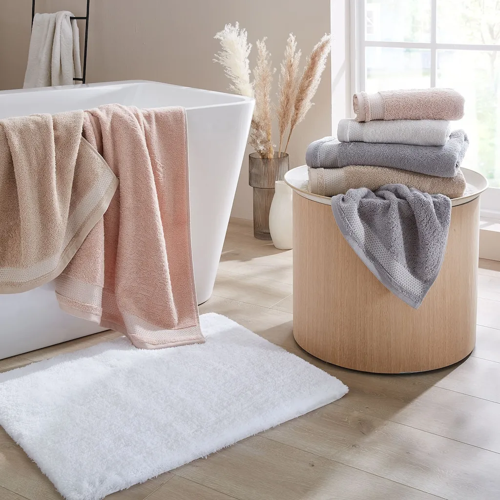 Мягкое махровое полотенце с ненавязчивой, элегантной блестящей каймой, доступно в 2 размерах: 50×100 см (полотенце для рук) и 70×140 см (душевое полотенце), 4 сдержанных цвета - идеально сочетаются, примерно 500 г/м² для приятного высыхания и хорошей впитываемости, легко ухаживать и долговечно - для ежедневного использования