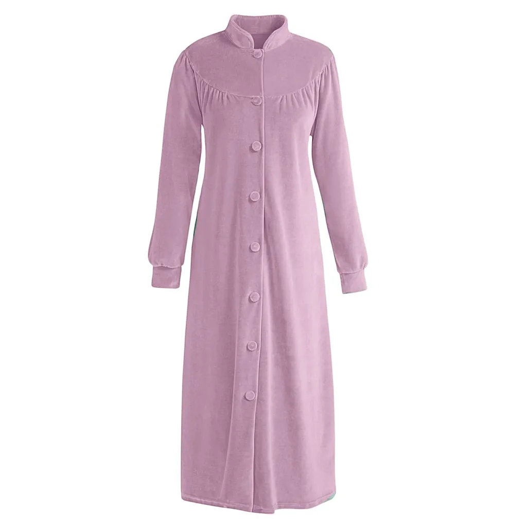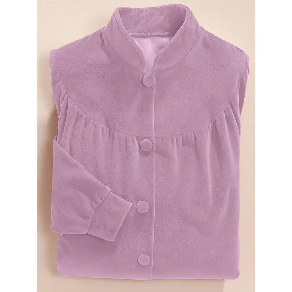 Халат Nicki из мягкого плюшевого материала с высоким воротником и круглой кокеткой. Полная застежка на пуговицы. 2 кармана. Рукава с манжетами. Состав: 80% хлопок, 20% полиэстер.