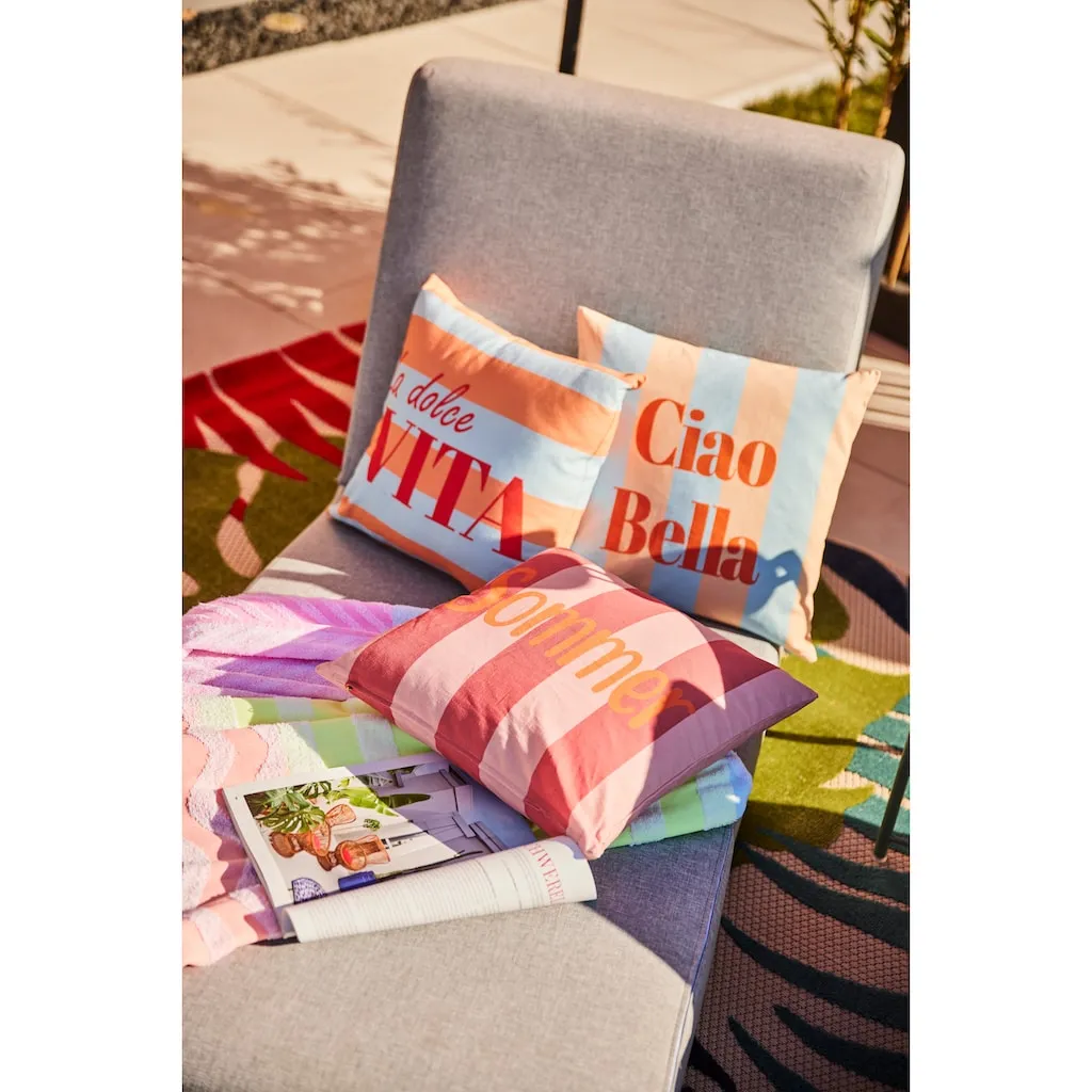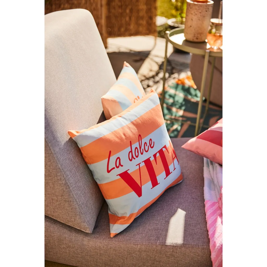 Наволочка с надписью LA DOLCE VITA. Цифровая печать с обеих сторон, с молнией. Из переработанного хлопка. 100% хлопок. Можно стирать.