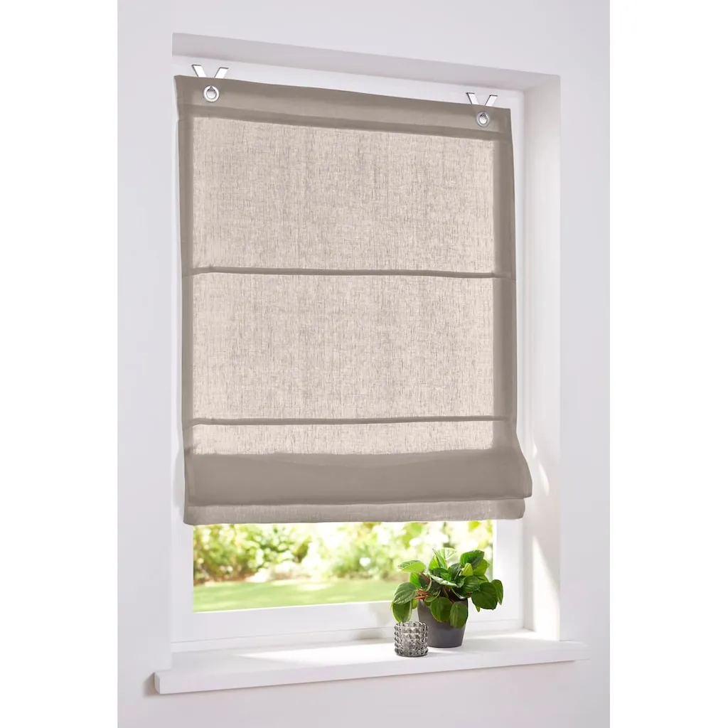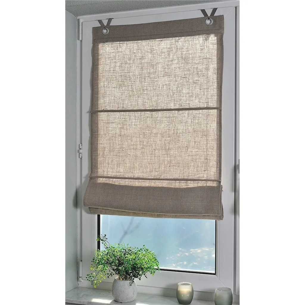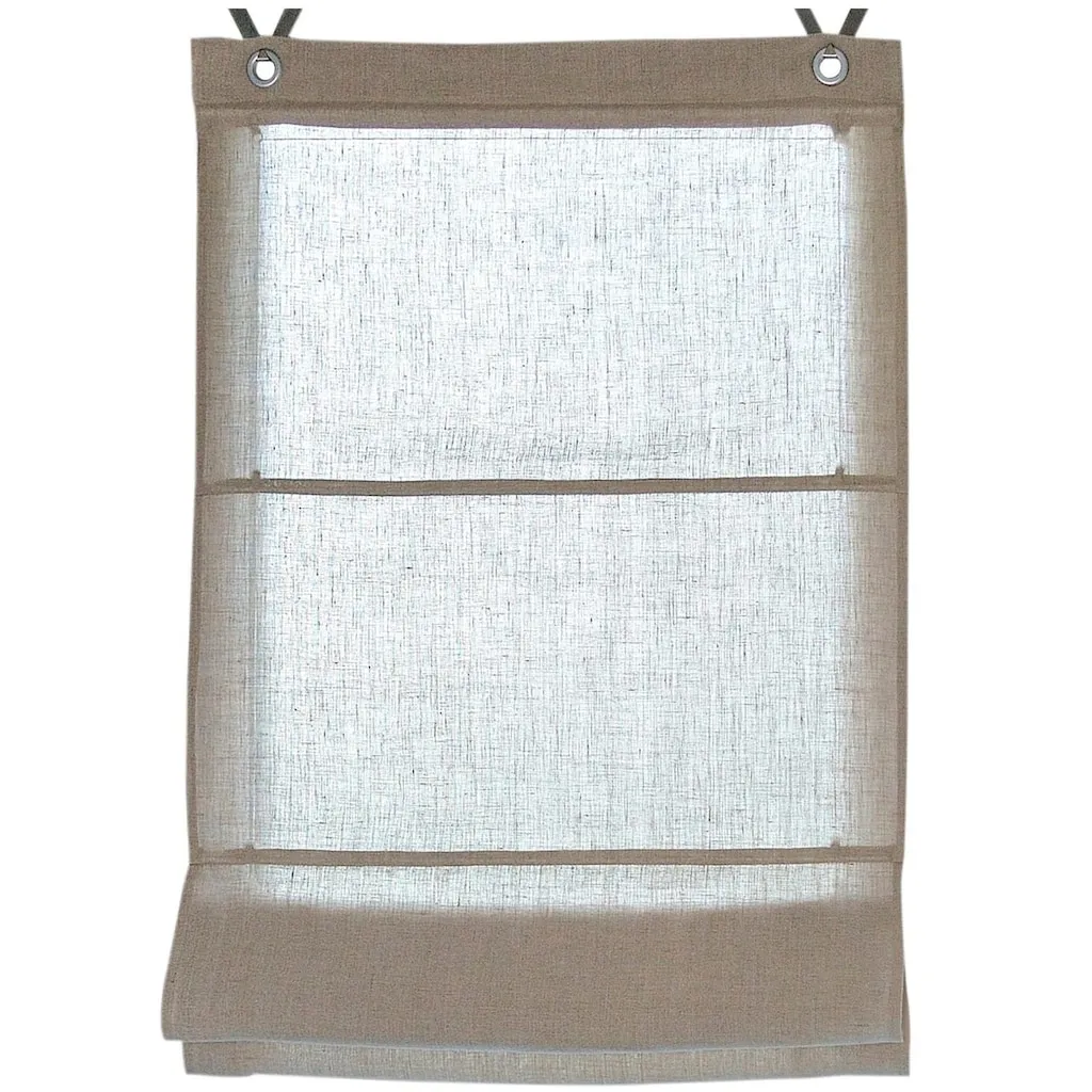 Римская штора из плотного льняного материала. Размер 5, подходит для балконных дверей или окон от пола до потолка. С люверсами для простого крепления на оконной раме. Поставка включает крючки. Ширина 45-80 см: 2 крючка, ширина 100 см: 3 крючка. 100% лен. Можно стирать.