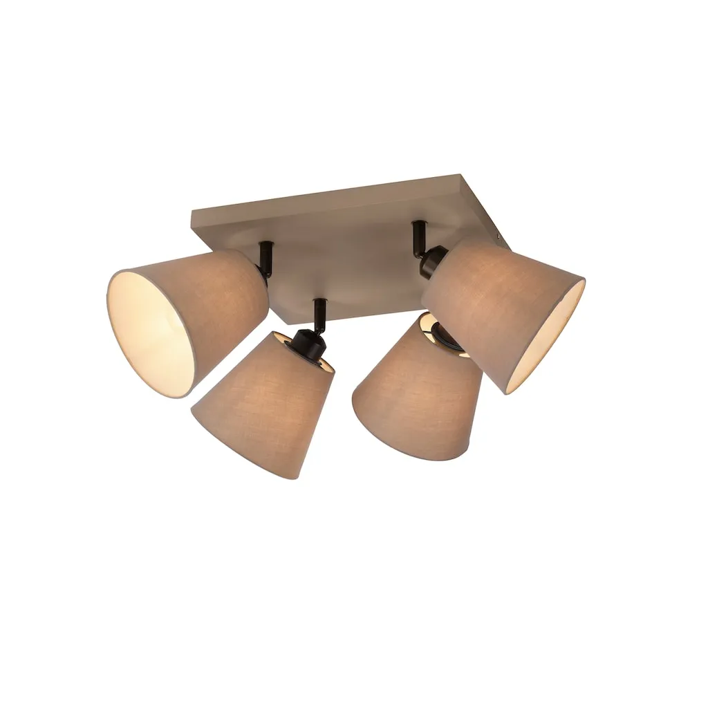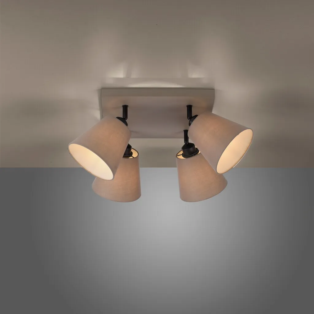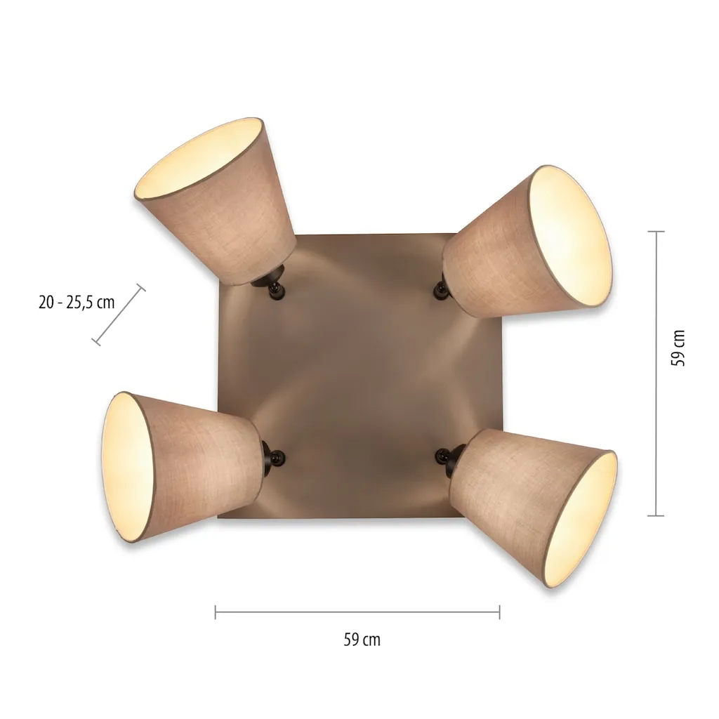 Потолочная лампа RIALA с простым дизайном в модном цвете таупе универсально сочетается с интерьером. Квадратный потолочный корпус цвета таупе контрастирует с матово-черными держателями спотов. На них закреплены конусообразные тканевые абажуры того же цвета таупе. Свет мягко рассеивается в окружающее пространство, а снизу абажуры открыты. Абажуры можно вращать и наклонять, чтобы направлять свет по вашему усмотрению. Потолочную лампу можно оснастить четырьмя лампами E27 мощностью до 40 Вт.