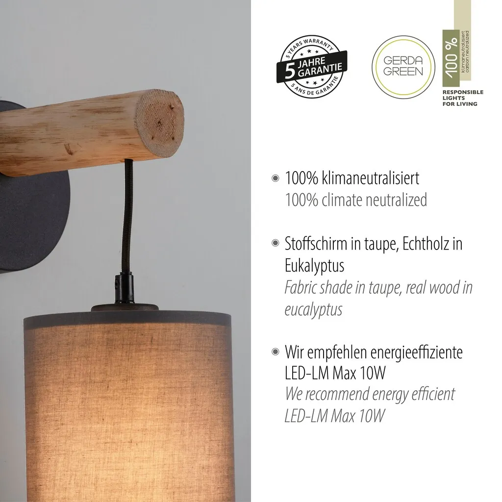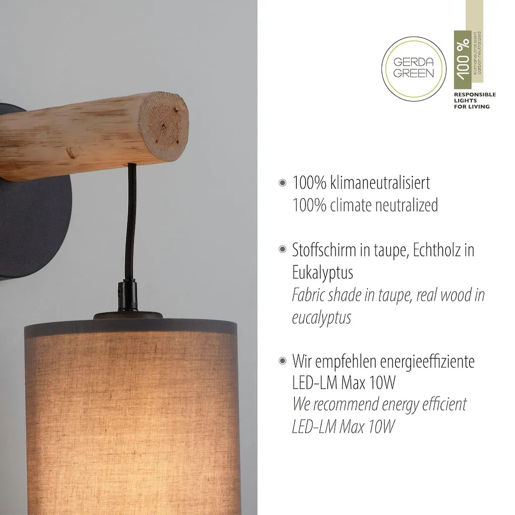 Настенный светильник GREEN TRIBU сочетает в себе домашний дизайн с экологически безопасными характеристиками, создавая тем самым уютную атмосферу. Настенный светильник представлен с абажуром цвета тауп, который обеспечивает мягкий и рассеянный свет. Окуните свои помещения в приятную и теплую атмосферу, которая приглашает к отдыху и комфорту. Светильник предназначен для цоколя E27 и может использоваться с максимальной мощностью 10 Вт. Благодаря совместимости с LED-лампами, он обеспечивает энергоэффективное освещение, экономя вам как энергию, так и деньги. Лампа в комплект не входит. Все компоненты этого светильника на 100% нейтрализованы с точки зрения углеродного следа. Сочетание эвкалиптового дерева и тканевого абажура не только эстетично, но и дает вам удовлетворение от вклада в защиту окружающей среды. Сделайте заявление о стиле и устойчивом развитии.
