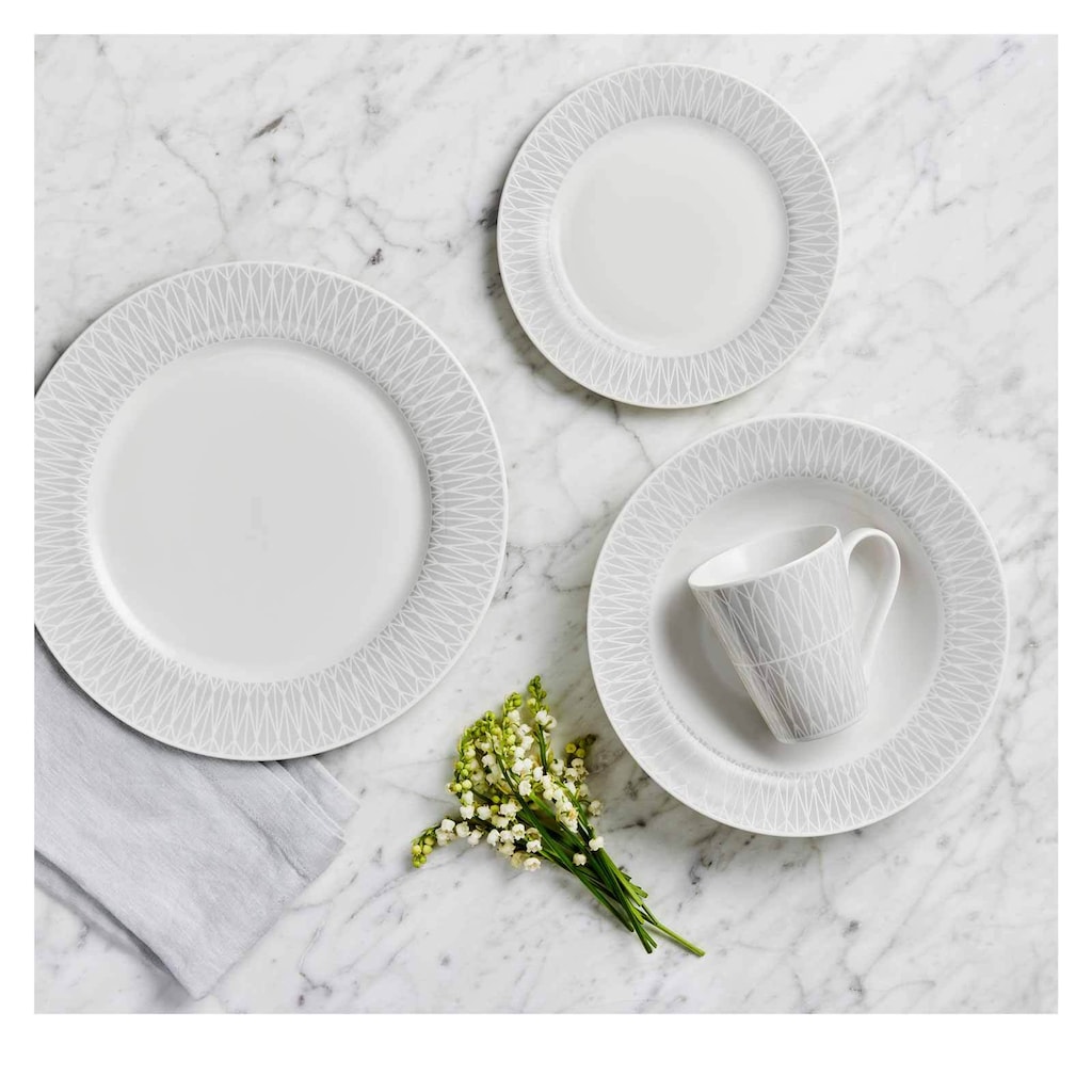 16-предметный комплект для ужина на 4 человека от Maxwell & Williams. В комплект входят: 4 обеденные тарелки, 4 завтраковые тарелки, 4 суповые тарелки и 4 кофейные кружки. Материал: фарфор -> подходит для посудомоечной машины, микроволновой печи, духовки и морозильника. Обеденные тарелки: ø 27,5 см / высота 2 см - Завтраковые тарелки: ø 19 см / высота 1,5 см - Суповые тарелки: ø 23 см / высота 4,3 см / 700 мл - Кофейные кружки: ø 9 см / высота 10 см / 300 мл. Текстурированный край с геометрическим узором.