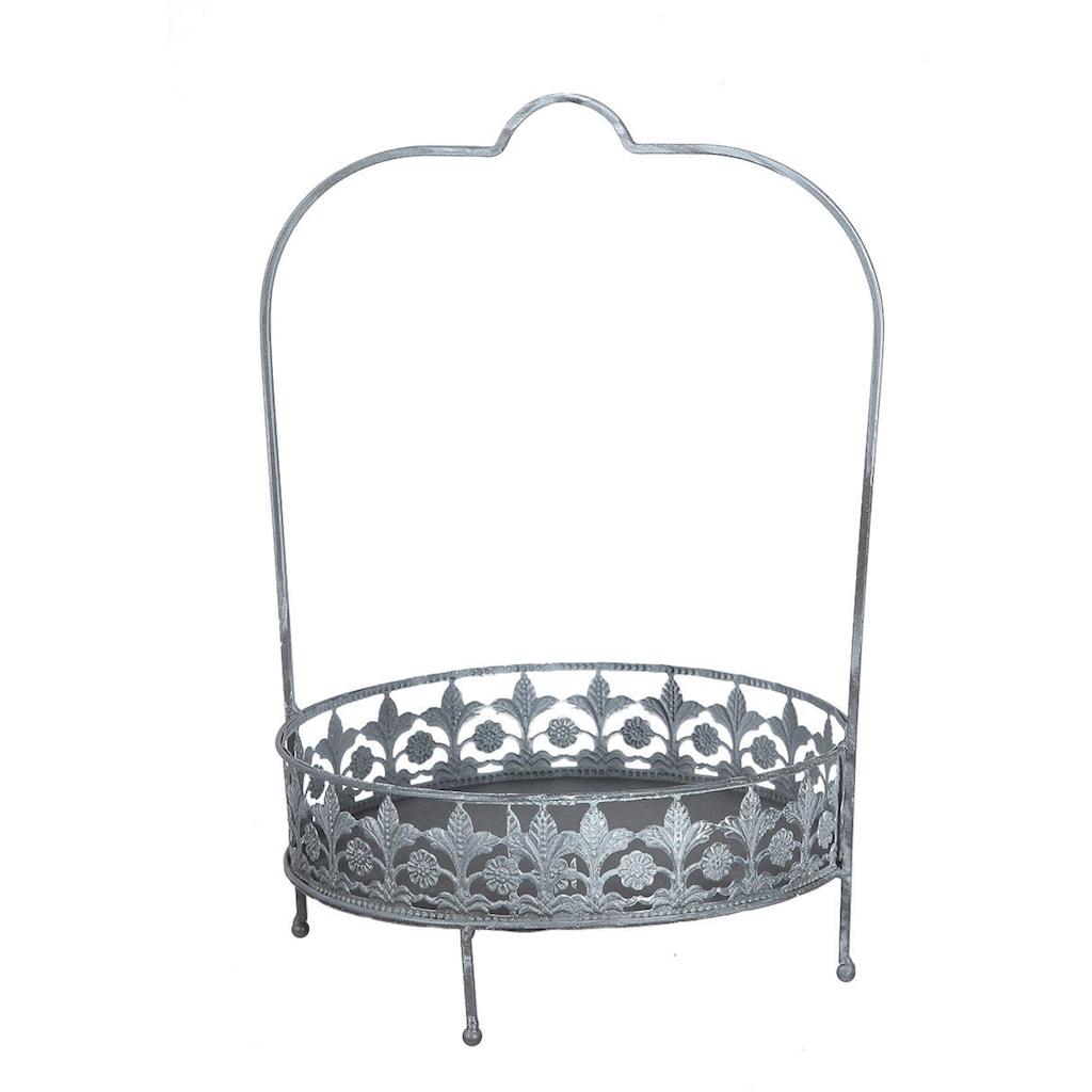 Чайное время! Наш красивый этажерка прекрасно подходит для того, чтобы стильно подавать вашим гостям пирожные или другие сладости, создавая запоминающуюся атмосферу. Конечно, этажерку также можно украсить цветущими растениями, что создаст особую атмосферу в вашем доме или саду. Этажерка была тщательно изготовлена из железа с использованием специального лакировочного покрытия в античном ржаво-сером оттенке с белой отмывкой. Диаметр основания: 27 см - Высота: 37 см.