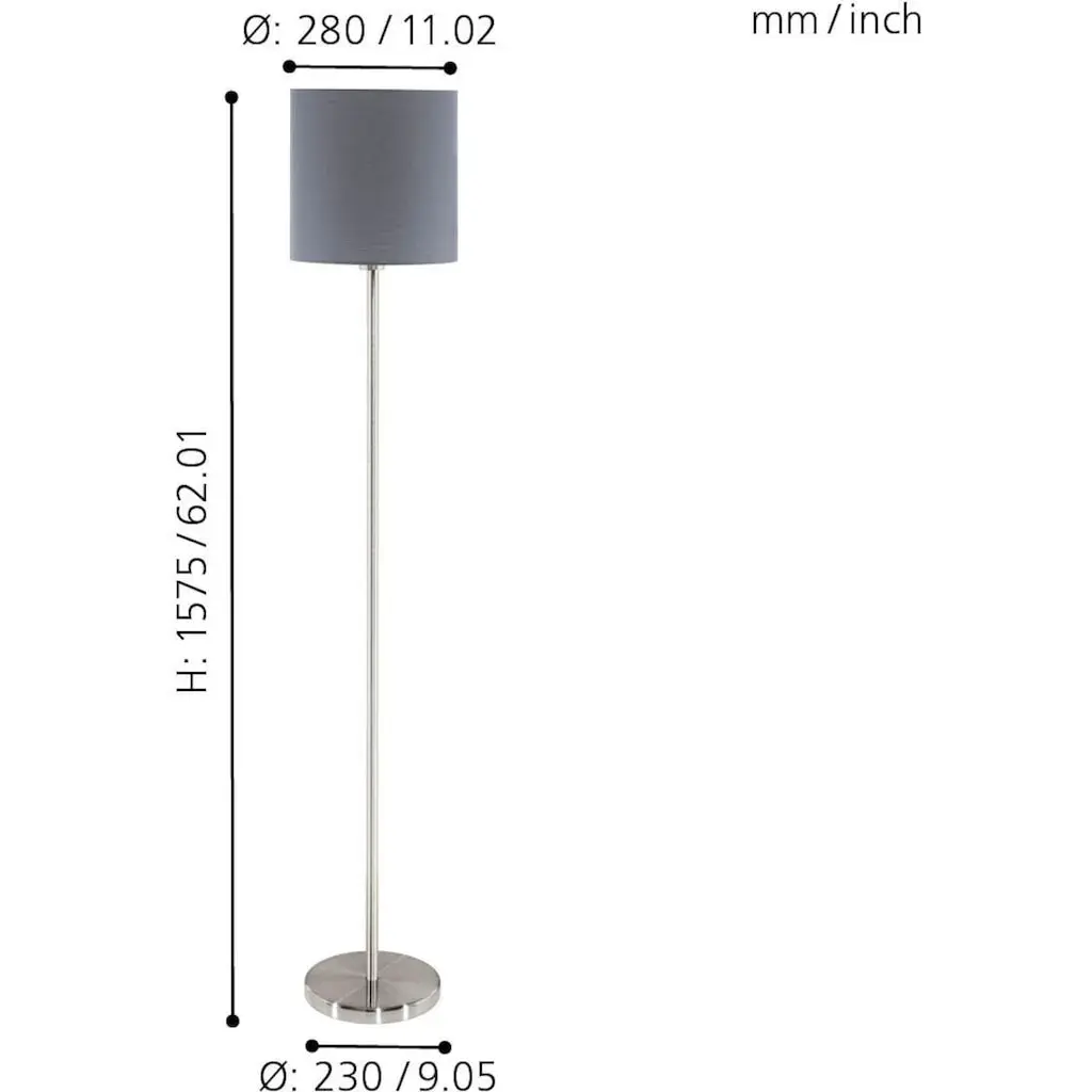 Оптика/Стиль Цвет: серый/никелевый Форма: круглая Материал Материал: каркаса: металл Материал: абажура: текстиль Размеры Диаметр абажура: 28 см Высота: 157,5 см Длина кабеля: 210 см Информация о продукте Лампа: без лампы Количество плафонов: 1 Патрон: E27 Выключатель: ножной Модель: 95166 Тип питания: сетевой кабель Комплектация: инструкция по сборке; без лампы Источник питания Тип сетевой вилки: евро (Тип C-CEE 7/16) Технические данные Рег. номер WEEE DE: 41.220.337