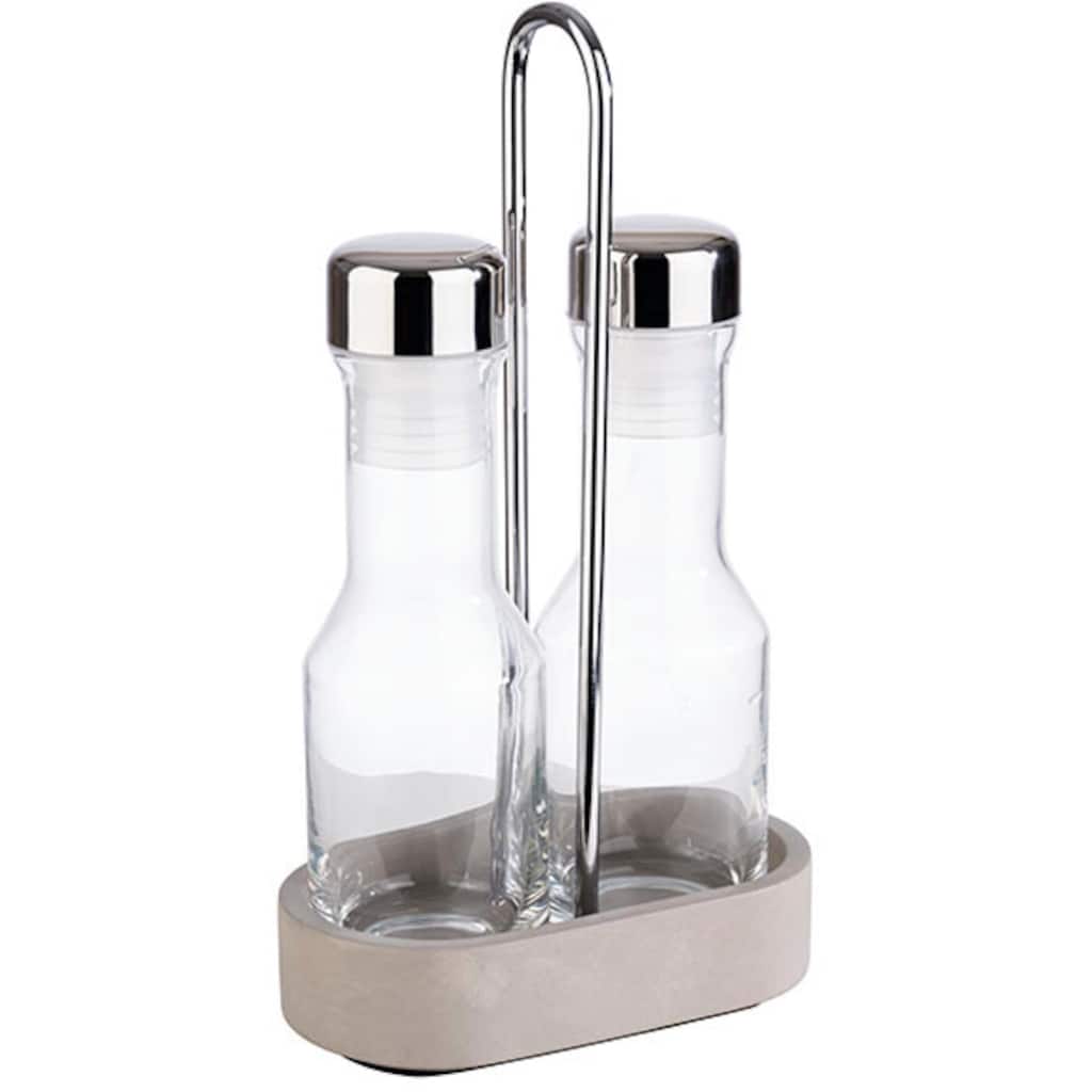 Набор для стола - это замечательный помощник на кухне. Подставка выполнена из бетона с защитным дном, чтобы не царапать мебель. Оба стеклянных контейнера с крышками из нержавеющей стали и пластиковым носиком, предотвращающим капли. Этот устойчивый строительный материал со своей грубой текстурой выглядит одновременно стильно и современно. Бетон стал устоявшимся трендом в интерьере.
