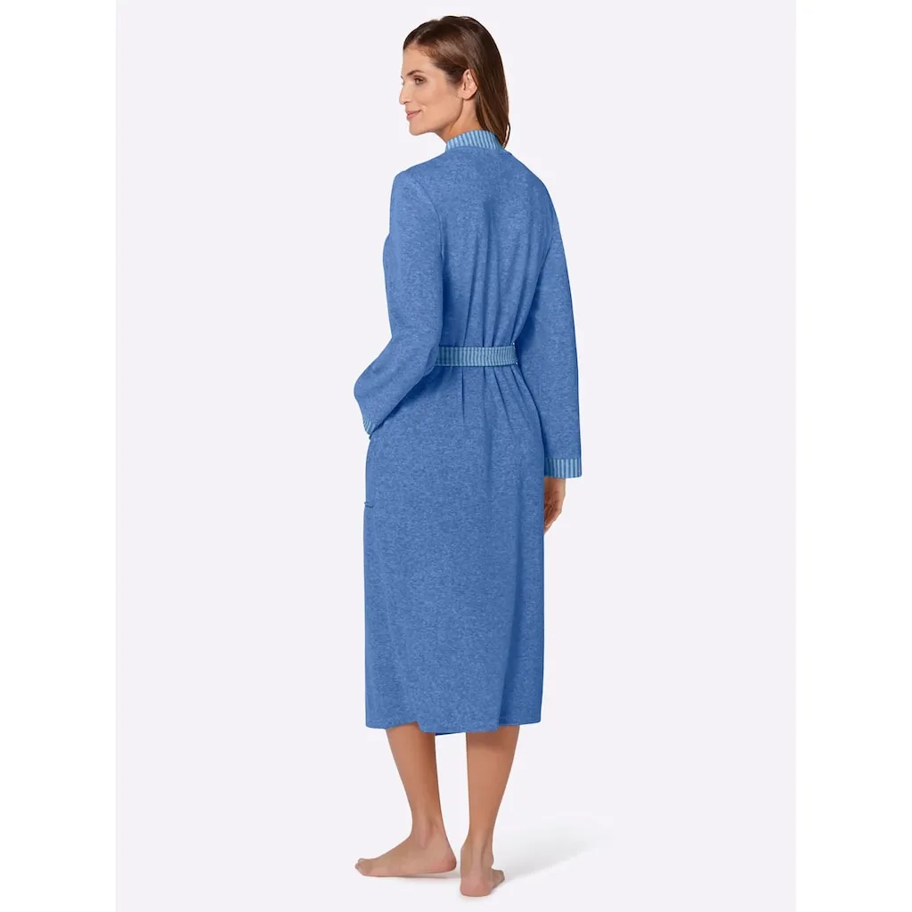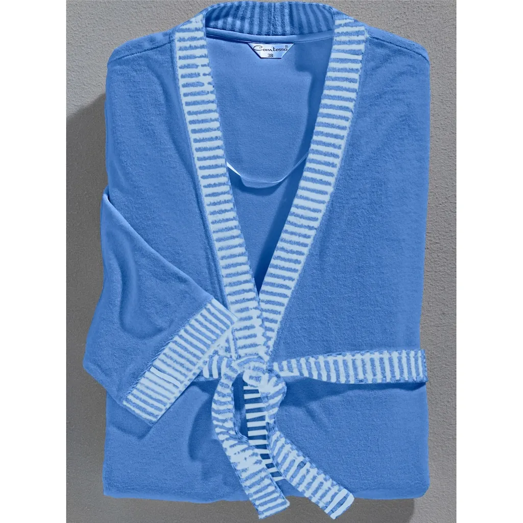 Халат от Comtessa из мягкой легкой махровой ткани. Классическая кимоно-форма. Воротник, пояс и клапаны карманов в полоску. С петлями для пояса. 80% хлопок, 20% полиэстер.
