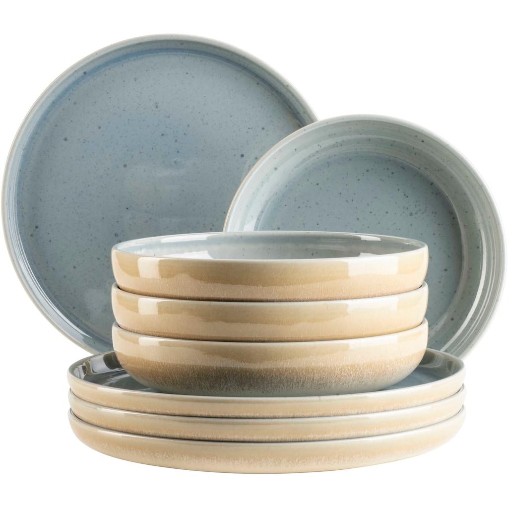 Комплект столовой посуды на 8 предметов с 4 плоскими тарелками (27 см) и 4 глубокими тарелками (20 см), изготовленный из прочного каменного фарфора. Элегантный пастельный цвет и уникальная реактивная глазурь придают посуде особое очарование; Сделано в Португалии. Этот набор посуды идеально подходит как для повседневного использования, так и для праздничных мероприятий и ужинов. Комплект тарелок элегантно и стильно представляет основные блюда, салаты и закуски. Подходит для посудомоечной машины и микроволновой печи, прочный и долговечный для простого использования.