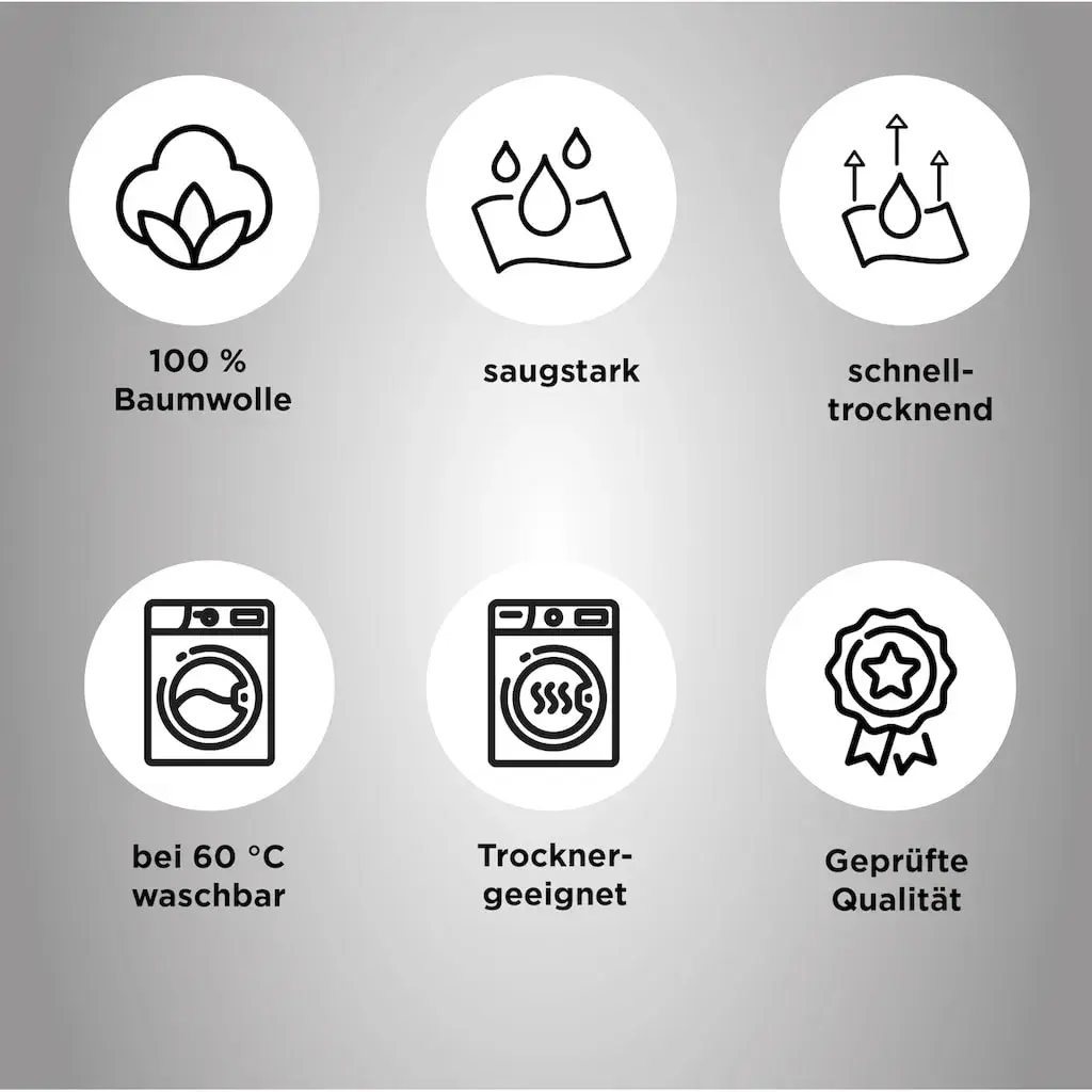 100% хлопок - универсально используемый на кухне и в быту, размер 50 x 70 см для различных применений, плотность 200 г/м² - приятный на ощупь, машинная стирка - легкая очистка, набор из 10 или 20 полотенец - удобно для запаса
