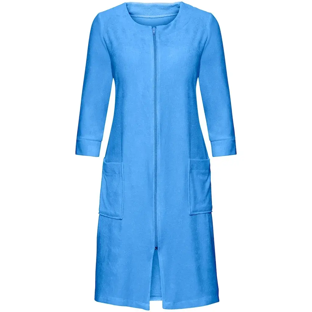 Халат из мягкого легкого махрового полотна. С круглым вырезом, застежкой-молнией по всей длине и 2 накладными карманами. Рукава 3/4 с небольшим разрезом. 80% хлопок, 20% полиэстер.