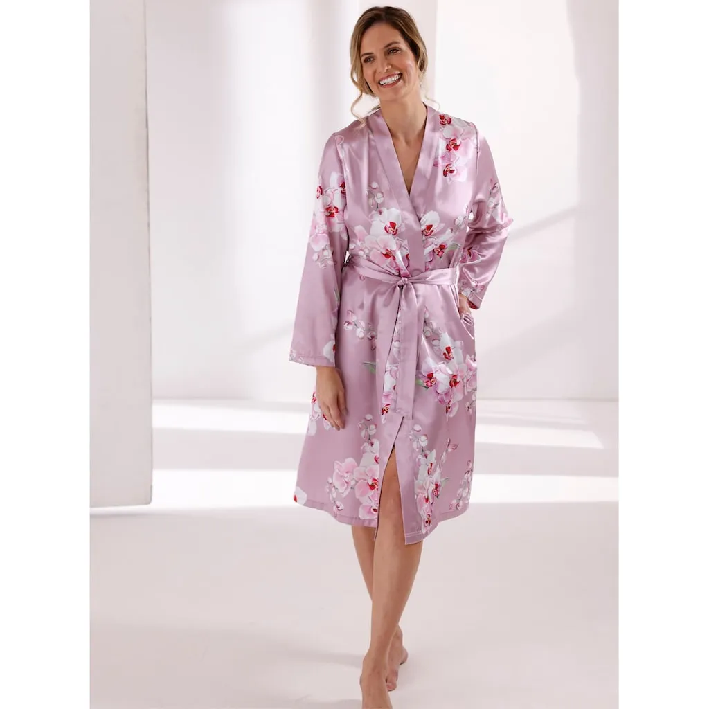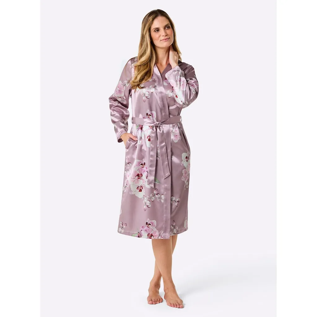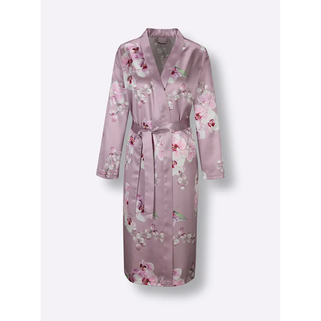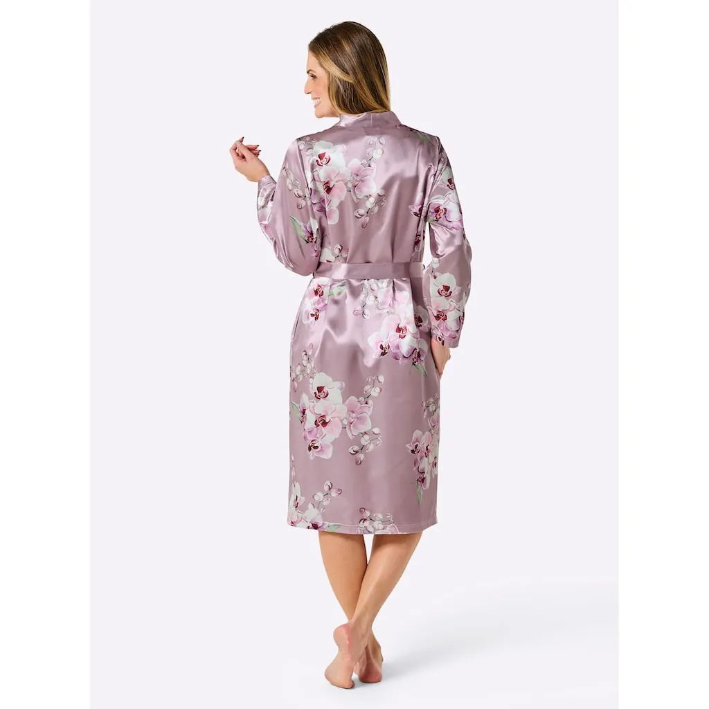 Просто мечта! Халат с романтическим цветочным рисунком. Скупо отделан тесьмой. Элегантно блестящий, из сатиновой ткани. На коже ощущается только мягкая ворсистая хлопковая подкладка. Пояс с петлями для пояса, 2 кармана. 83% полиэстер, 17% хлопок.