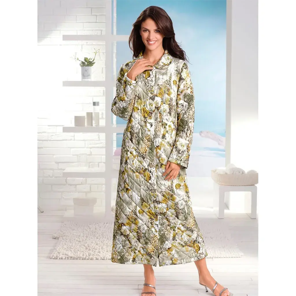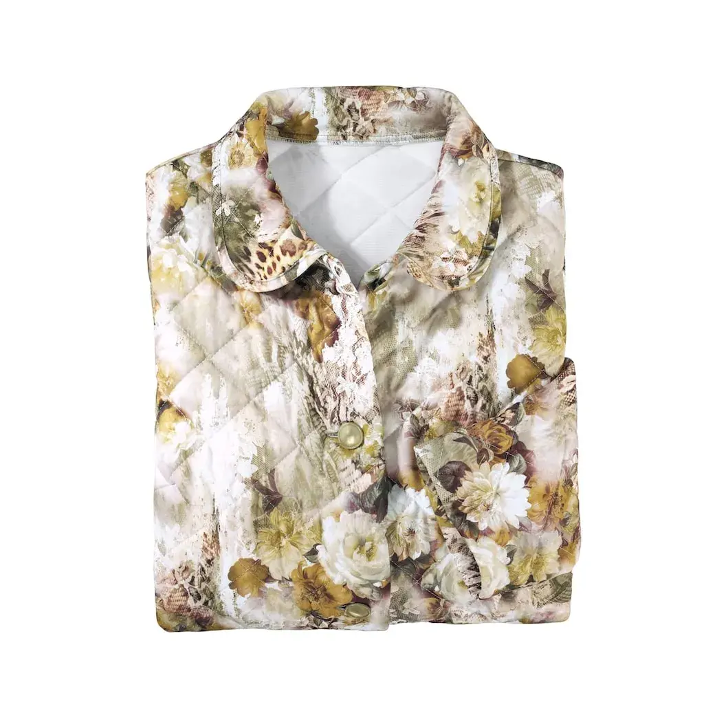 Цветы и орнаменты украшают привлекательный стеганый халат с отложным воротником, сплошной застежкой на пуговицы и одним швом-кармашком. Внутри ватиновая подкладка. 100% полиэстер.