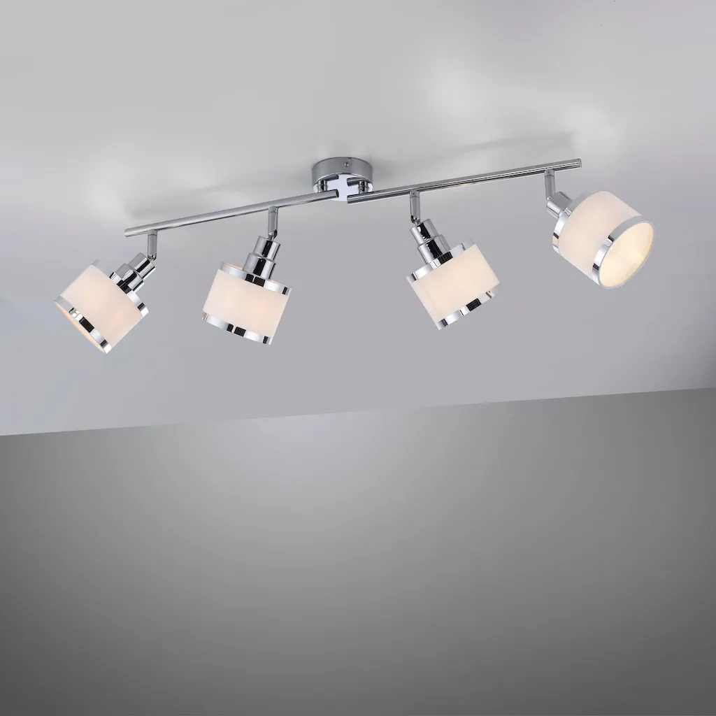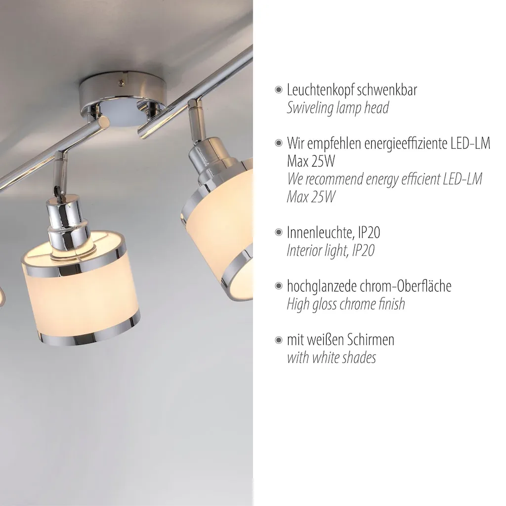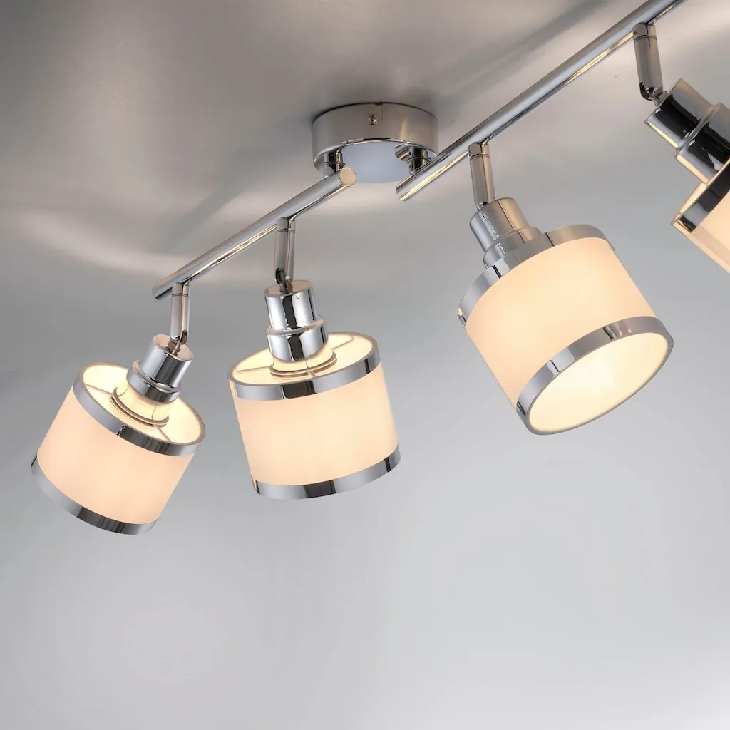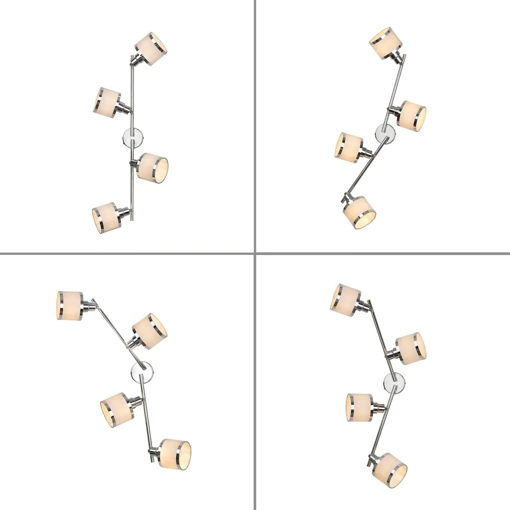Потолочный светильник ACCOR выделяется блестящей хромированной поверхностью и мастерски подчеркнут четырьмя абажурами. Каждый из светильников можно поворачивать и наклонять, что позволяет размещать их по желанию. Желаемые зоны в жилых помещениях освещаются идеально. Лампы в комплект не входят. ACCOR можно оснастить четырьмя лампами E14 мощностью до 25 Вт каждая. Оптимальным будет использование светодиодных ламп. Потолочная лампа многофункциональна и быстро займет подходящее место в вашем доме.