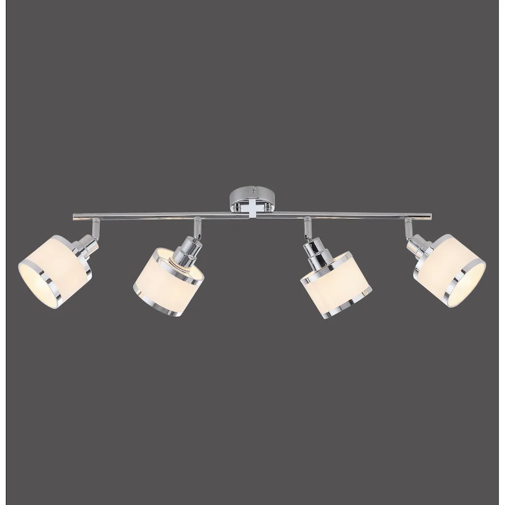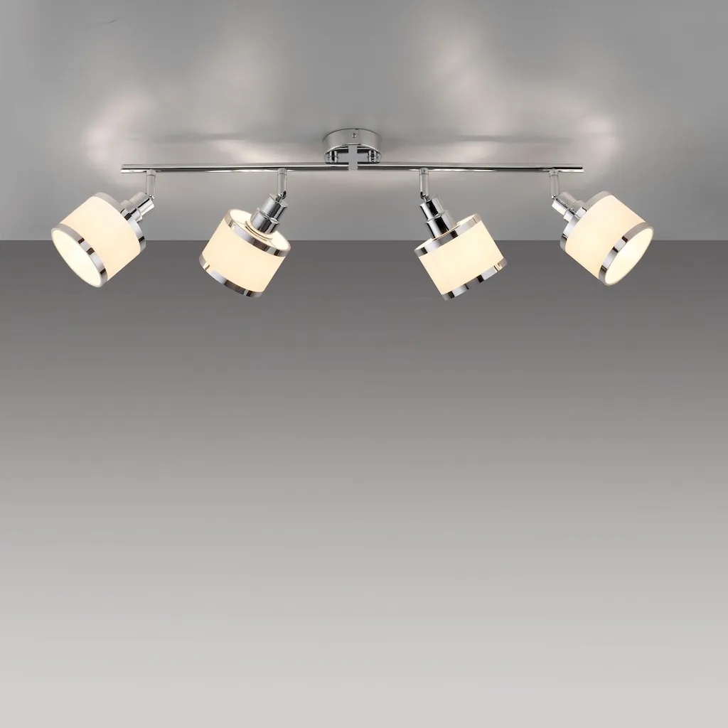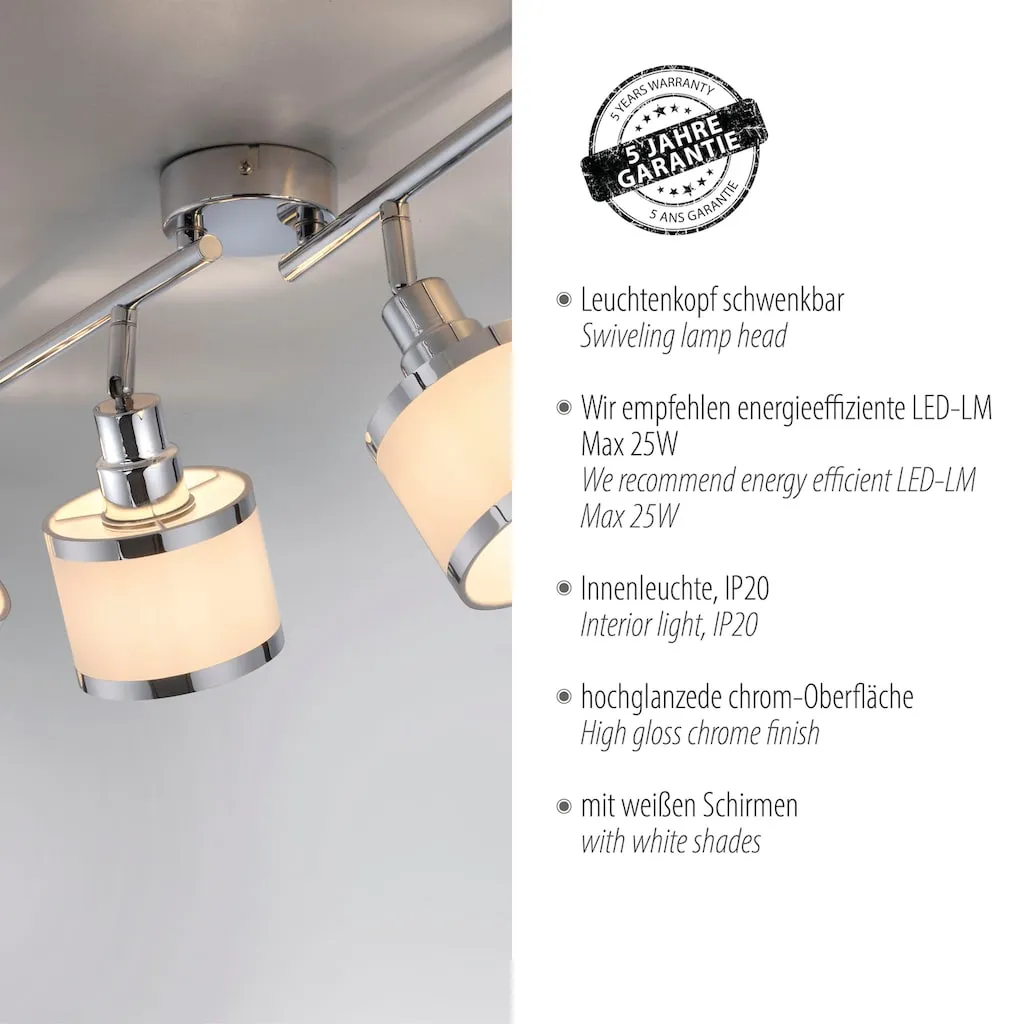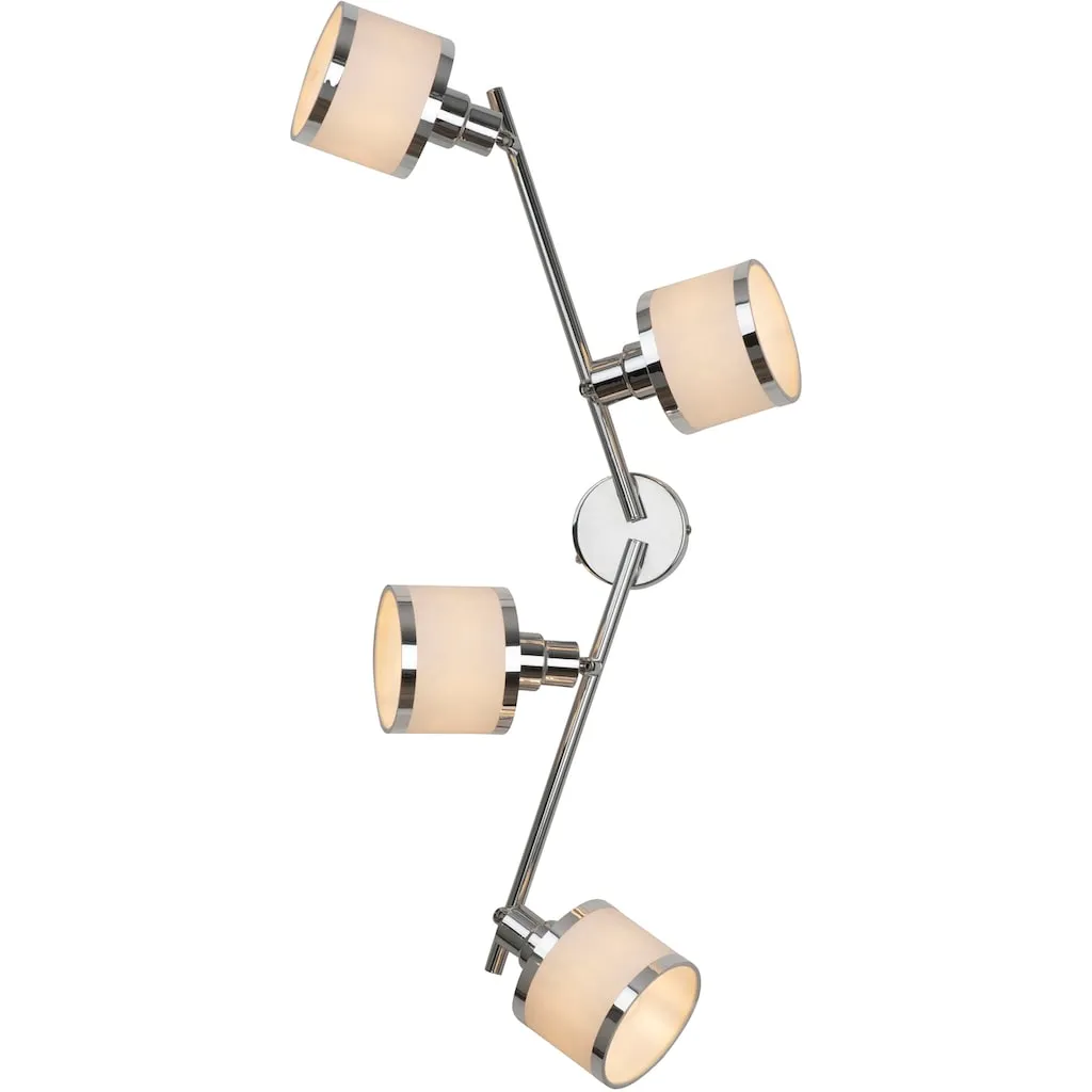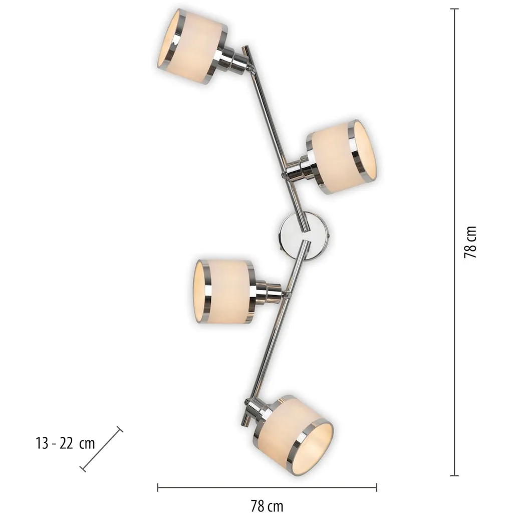 Потолочный светильник ACCOR выделяется блестящей хромированной поверхностью и мастерски подчеркнут четырьмя абажурами. Каждый из светильников можно поворачивать и наклонять, что позволяет размещать их по желанию. Желаемые зоны в жилых помещениях освещаются идеально. Лампы в комплект не входят. ACCOR можно оснастить четырьмя лампами E14 мощностью до 25 Вт каждая. Оптимальным будет использование светодиодных ламп. Потолочная лампа многофункциональна и быстро займет подходящее место в вашем доме.