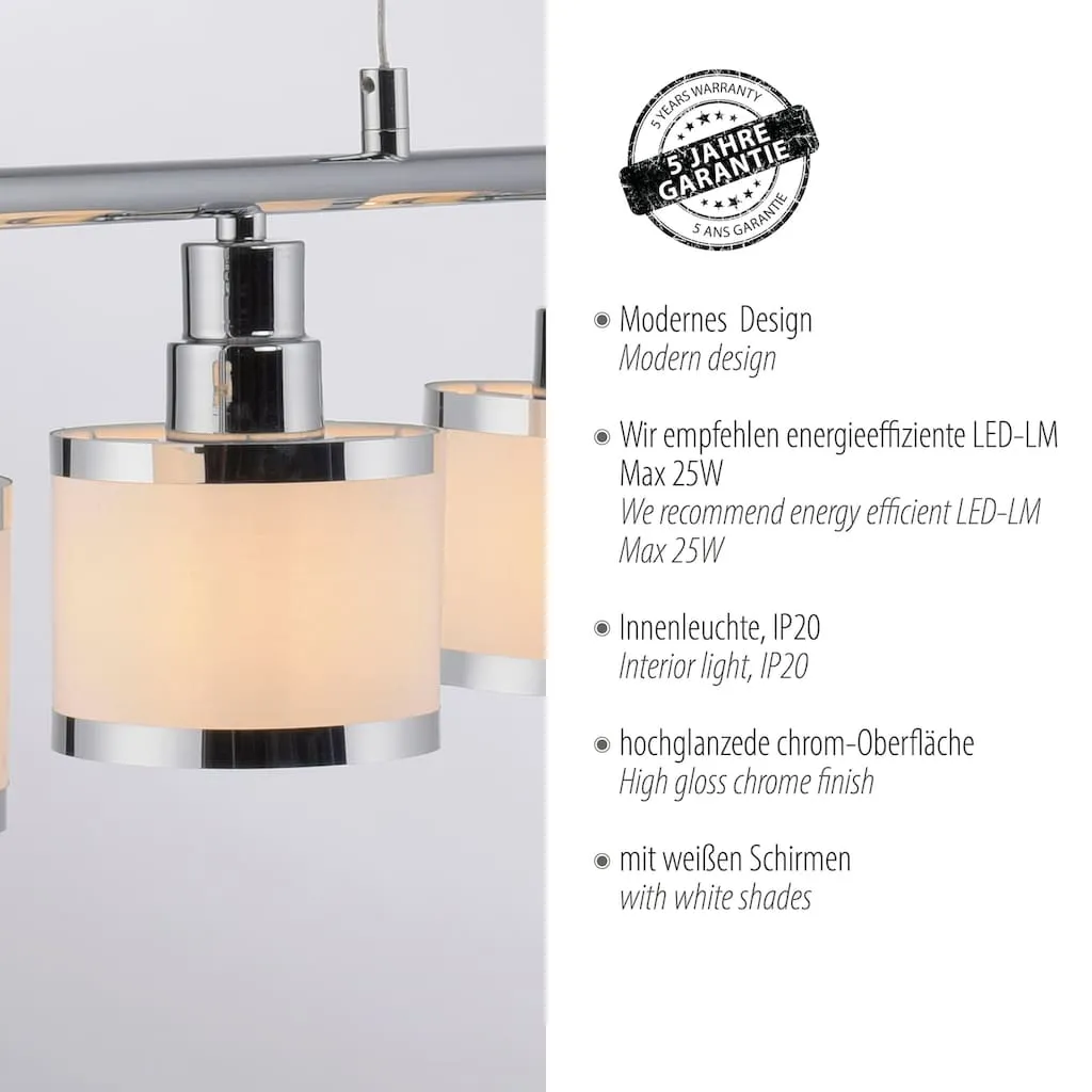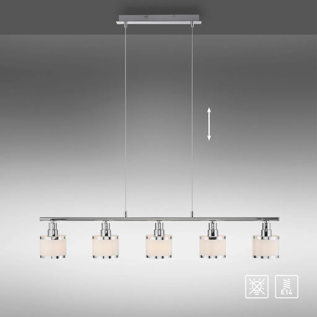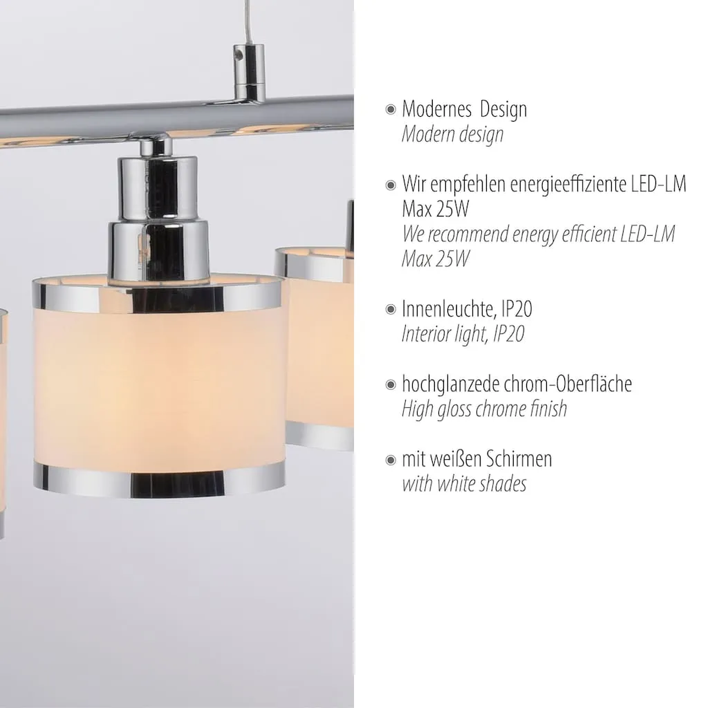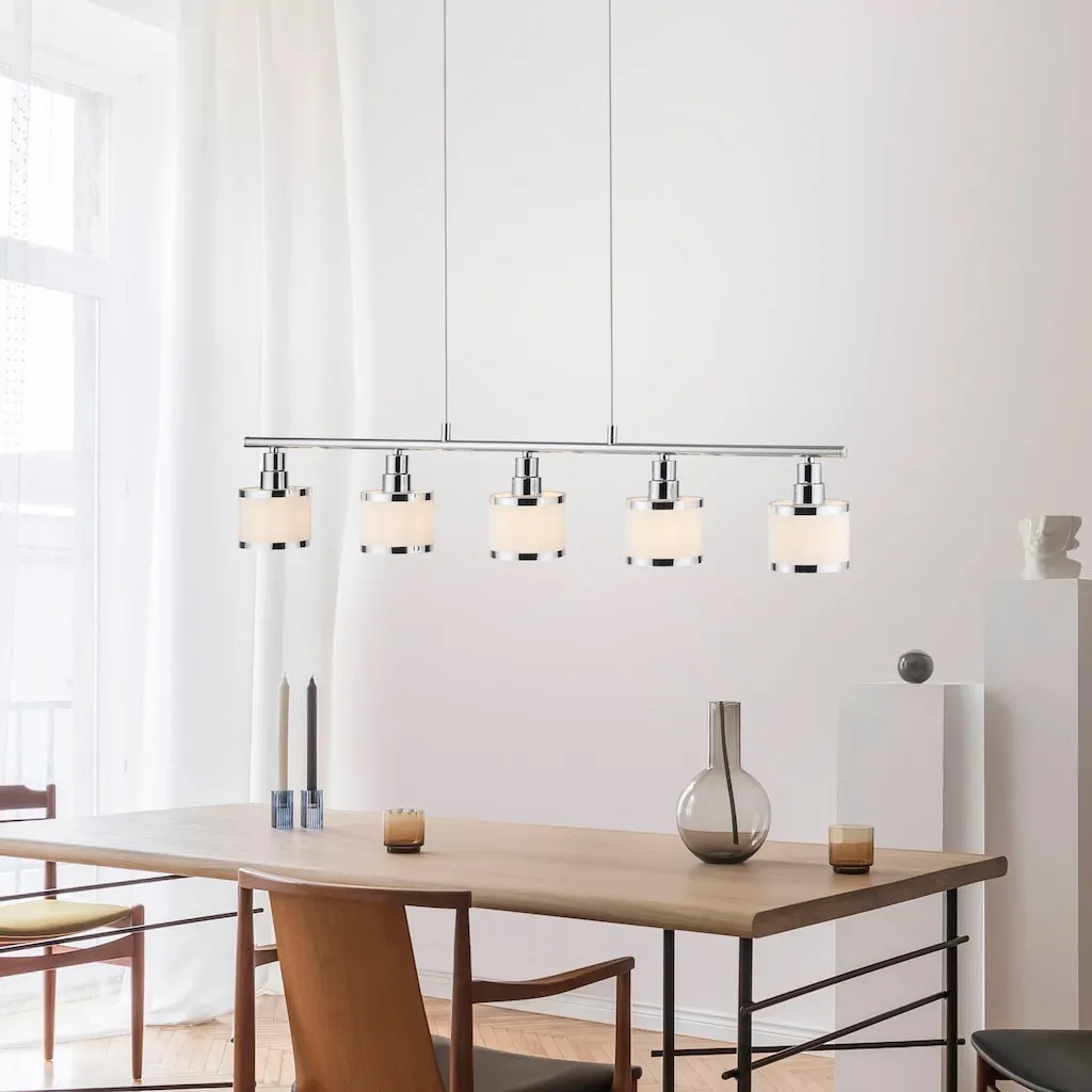 Подвесной светильник ACCOR эффектно представлен с глянцевой хромированной поверхностью и пятью абажурами. Лампы в комплект не входят. ACCOR может быть оснащен пятью лампочками E14 мощностью до 25 ватт каждая. Идеально подходят светодиодные лампы. Подвесной светильник гарантированно быстро займет подходящее место над вашим обеденным столом и освещает вашу еду в идеальном свете.