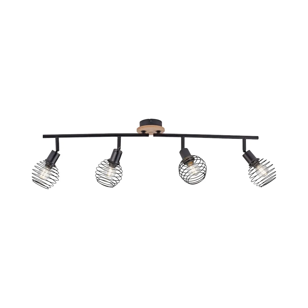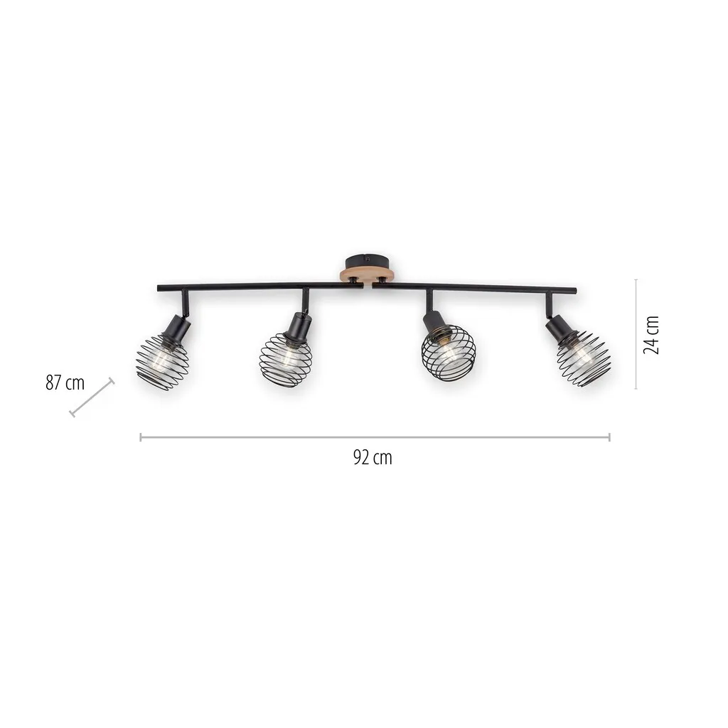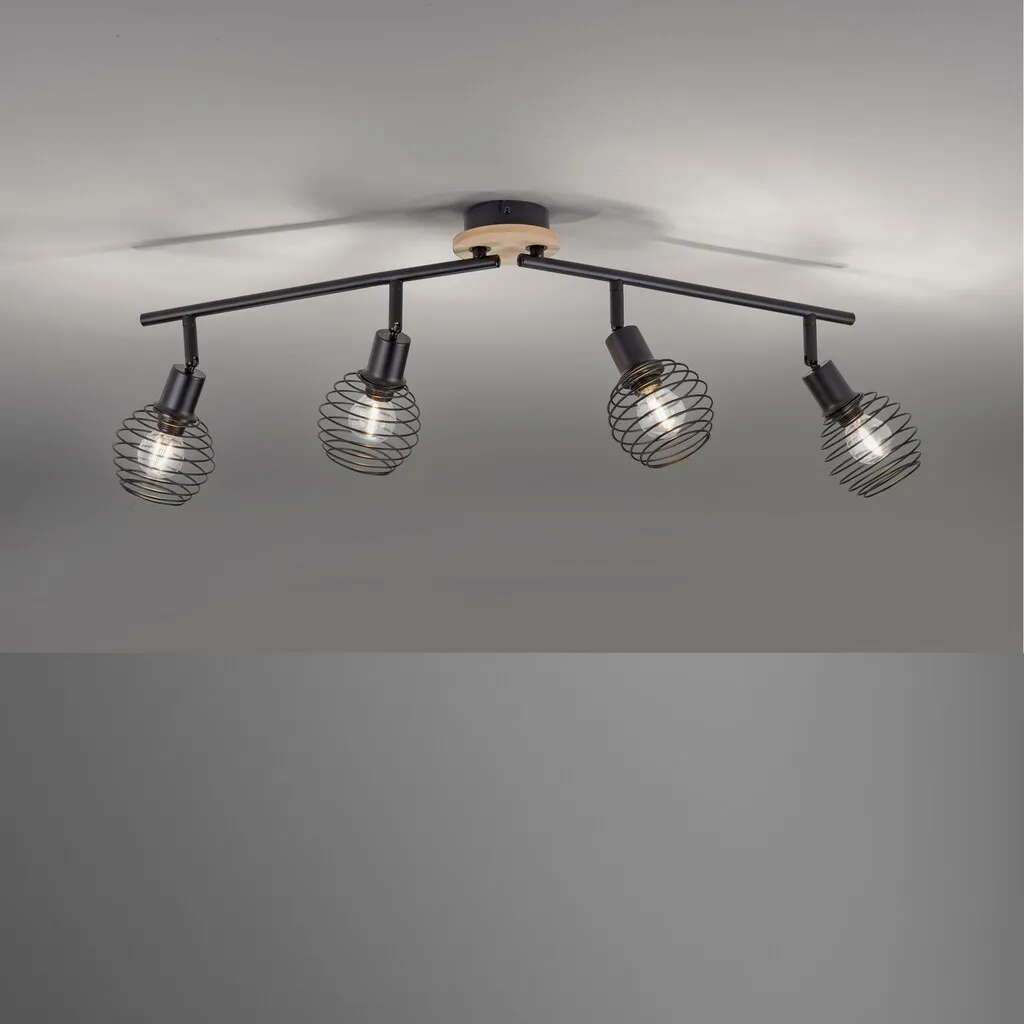 Черная четырехламповая настенная и потолочная лампа EUGEN благодаря своей отдельной накладке в декоре дуба приобретает уютный, домашний вид. Светильники можно поворачивать и наклонять в разные стороны, что позволяет осветить даже большие комнаты или длинные коридоры. Из-за открытой конструкции абажуров видно лампы, поэтому оптимально использовать лампы с нитью накаливания с цоколем E14 и мощностью до 40 Вт. Потолочная лампа с комбинированными материалами может быть сочетана с различными стилями интерьера: от винтажного до индустриального.