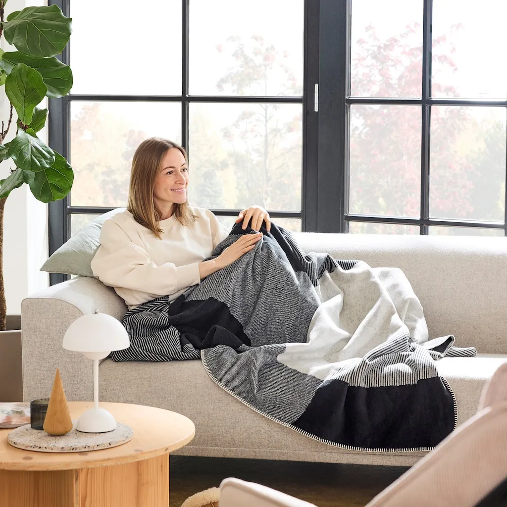 Искусство кривых! Простые округлые формы, перекрывающиеся поля и высокий контраст черного и белого делают покрывало Achmeta настоящим предметом, привлекающим внимание. Его можно стирать в стиральной машине при температуре до 30°C, и оно также подходит для сушки в сушильной машине. Обметочный декоративный шов гармонично завершает общий вид.