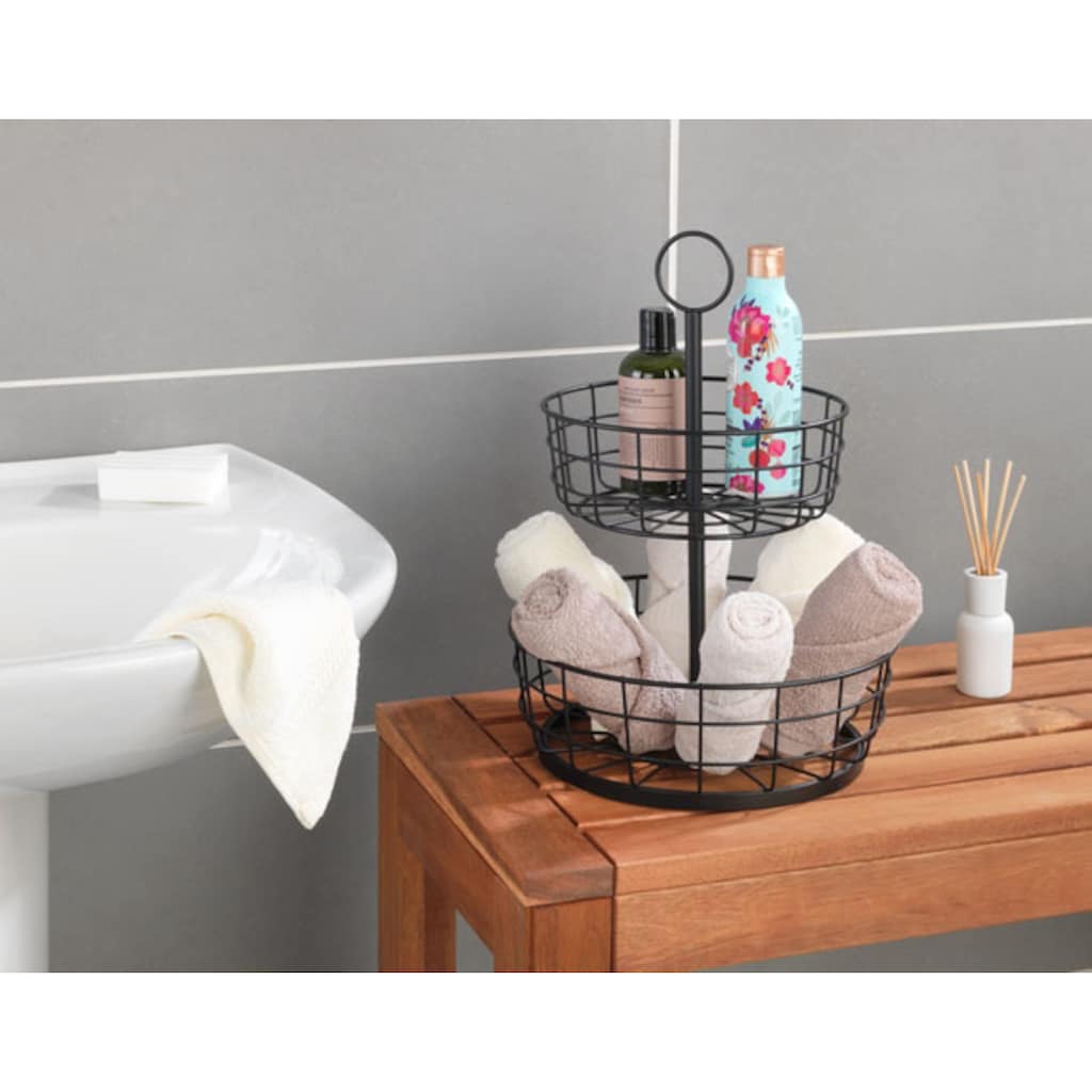 Компактная этажерка с двумя корзинами разного размера, Подходит для хранения фруктов и овощей или как полка в ванной или прихожей, Изготовлена из прочного порошково окрашенного железа, элегантного черного цвета, С круглой открытой ручкой в верхней части для легкой и безопасной переноски, Размеры (Ш/Г x В): Ø 28 x 39 см, большая корзина: (Ш/Г x В): Ø 28 x 9,5 см, маленькая корзина: (Ш/Г x В): Ø 22 x 8,5 см, Черный