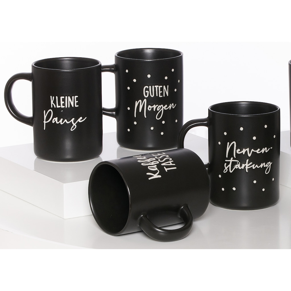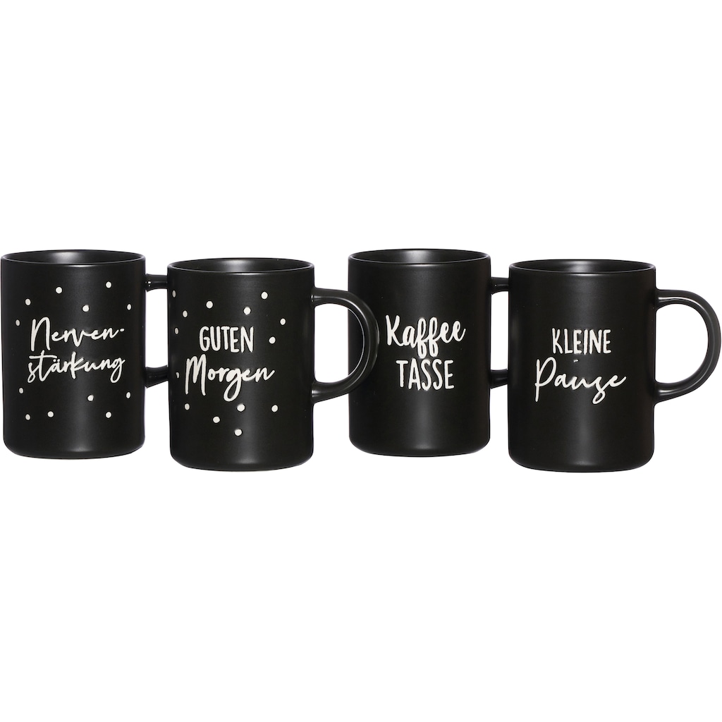 Наименование товара Количество штук: 4 шт. Материал Материал: фарфор Свойства материала: пригодно для контакта с пищей, подходит для микроволновой печи Подробности продукта Цвет: черный Количество ручек: 1 Использование: кофе, чай Объем: 330 мл Размеры Высота: 11 см Диаметр: 8 см Внешний вид/стиль Декор: надпись Внешний вид: с декором Примечания Инструкции по уходу: можно мыть в посудомоечной машине