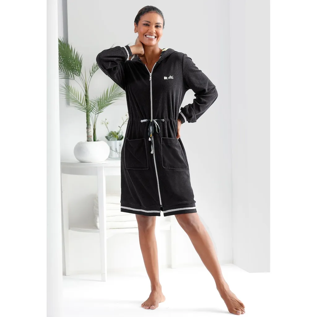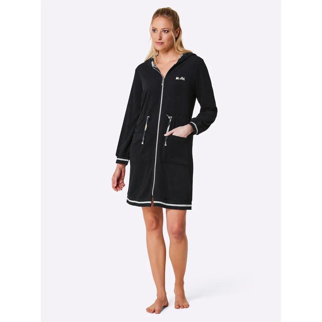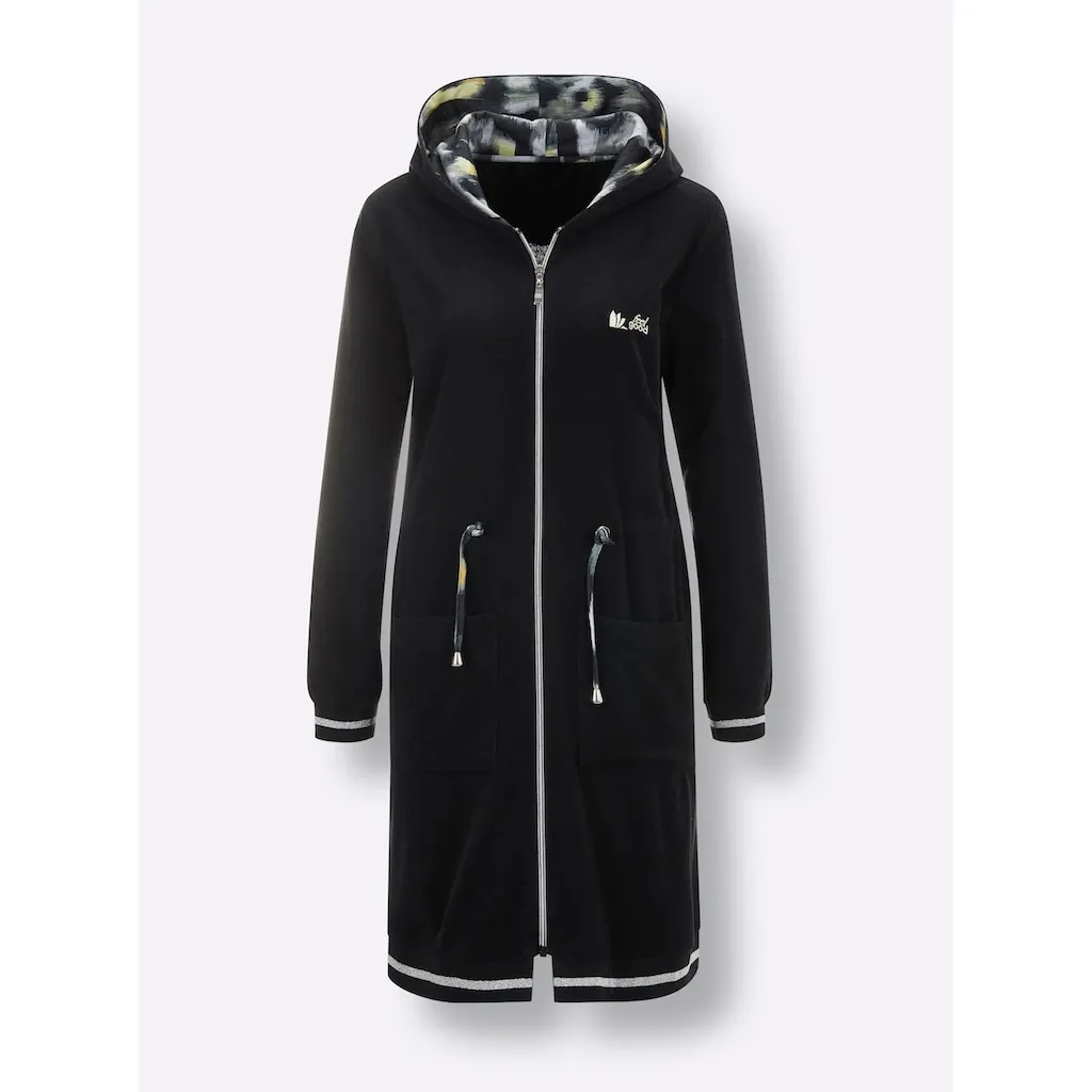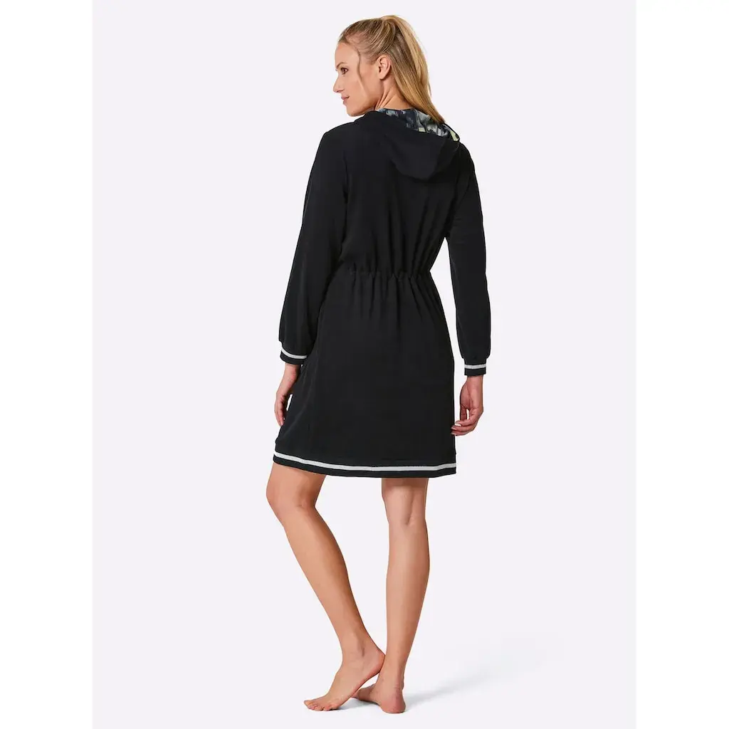 Стильный модный банный халат от feel good с узорчатой подкладкой в капюшоне и блестящими нитями на эластичных манжетах длинных рукавов и по кромке. С небольшой вышивкой логотипа. Бесступенчатая регулируемая кулиска на талии. 2 практичных кармана. Поддерживает инициативу Cotton made in Africa. 80% хлопок, 20% полиэстер.