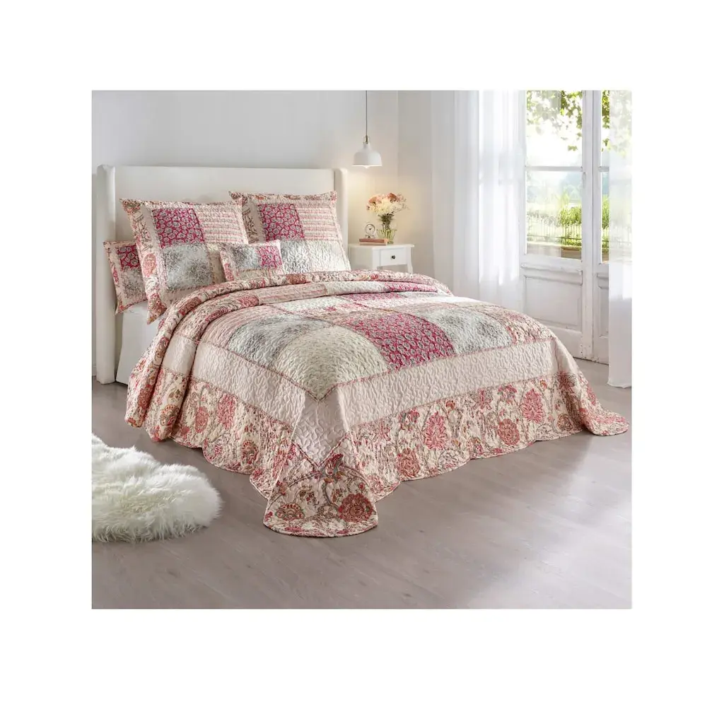 Лицевая сторона покрывала выполнена в сложной технике пэчворк с нашитыми рюшами. Цифровая печать, красивая вся поверхность декоративной стежки. Оборотная сторона с цветочным рисунком. Одеяло слегка наполнено, с изогнутым краем. Советы по правильному измерению доступны онлайн. Наволочка с скрытой молнией. 100% полиэстер. Машинная стирка при температуре до 30 °C.