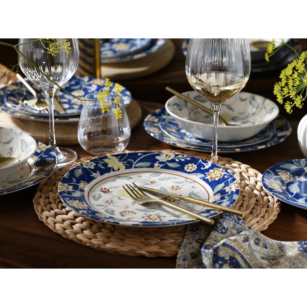 ПОЛНОЕ И КОМПАКТНОЕ: Набор из 12 предметов включает 4 обеденные тарелки диаметром 27 см, 4 десертные тарелки диаметром 21 см и 4 многофункциональные миски диаметром 20 см., КЛАССИКА: Традиционная форма с аккуратно обработанными плавными переходами., ДИЗАЙН ПО ТРЕНДУ: Полная поверхность с цветочным декором в средиземноморском стиле, игривый, элегантный, традиционный. Посуда для всех любителей красивых цветочных мотивов с актуальным сочетанием узоров!, НАСЛАЖДЕНИЕ: Посуда будет сопровождать вас в течение всего дня. Она необычайно долговечна и, разумеется, подходит для посудомоечной машины и микроволновой печи., КАЧЕСТВО БРЕНДА: Наша посуда разрабатывается в Германии и производится на выбранных премиальных фабриках, чтобы предоставить вам качество, которого вы желаете для вашего дома.