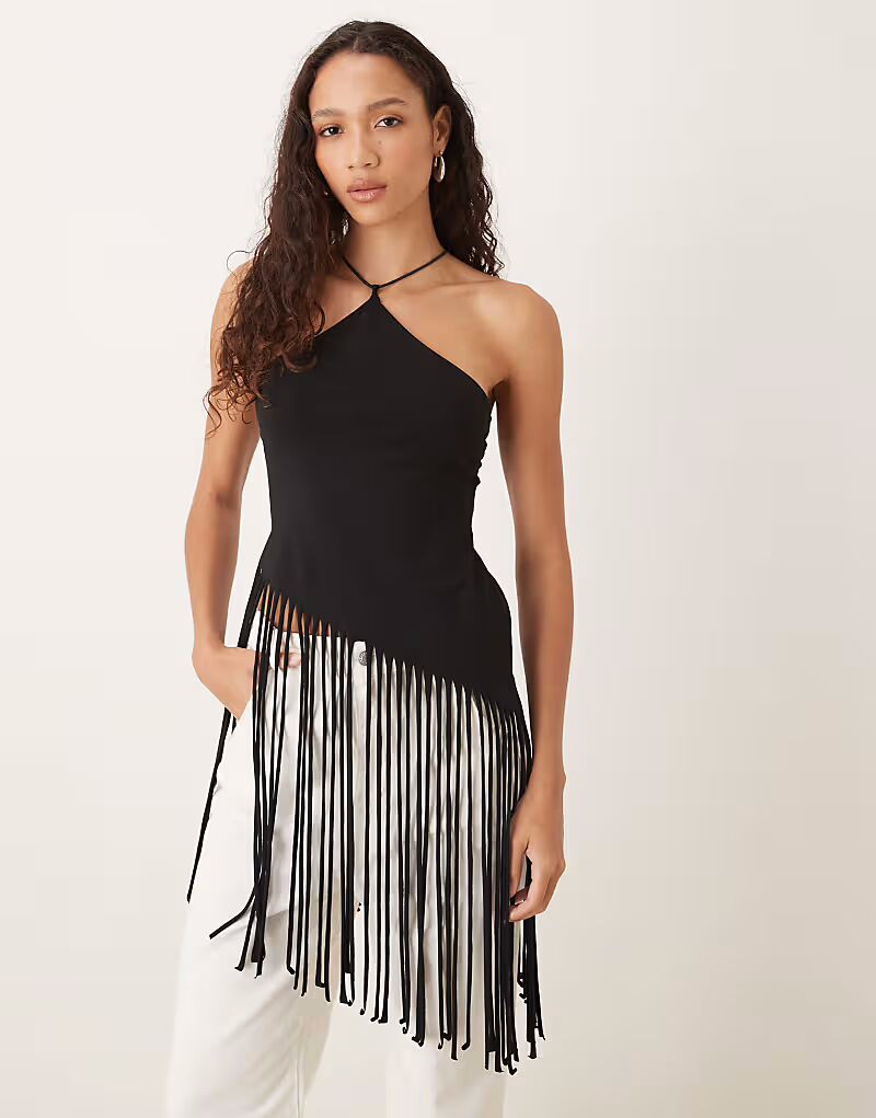 Удлиненный топ-халтер с бахромой черного цвета Asos Design