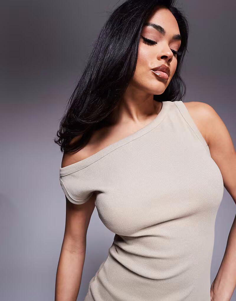 Мини-платье в рубчик со спущенным плечом Asos Design, серо-бежевый 3 569₽