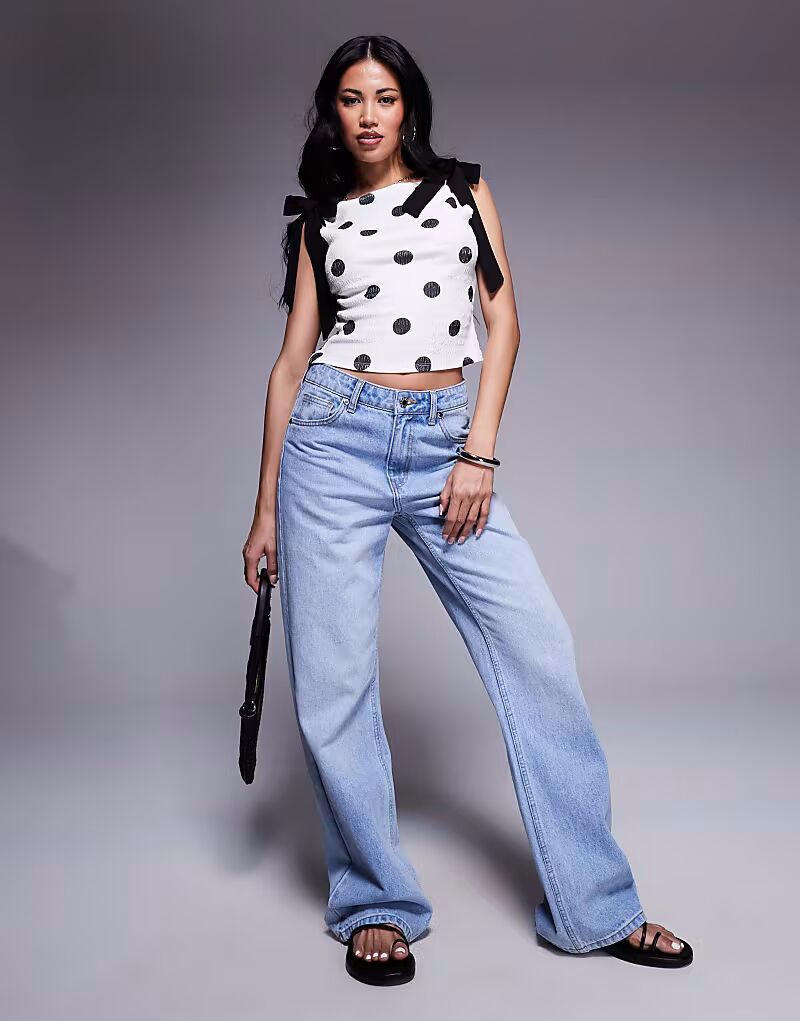 Топ с текстурированным черным бантом на плече с белым горошком Asos Design