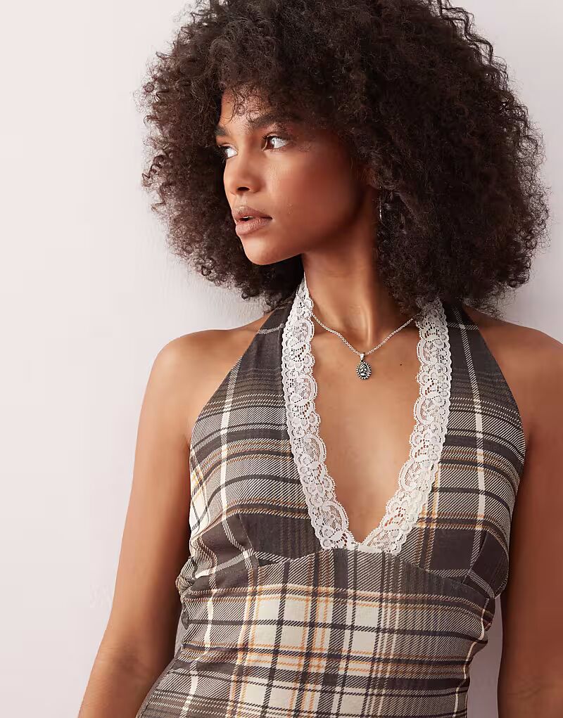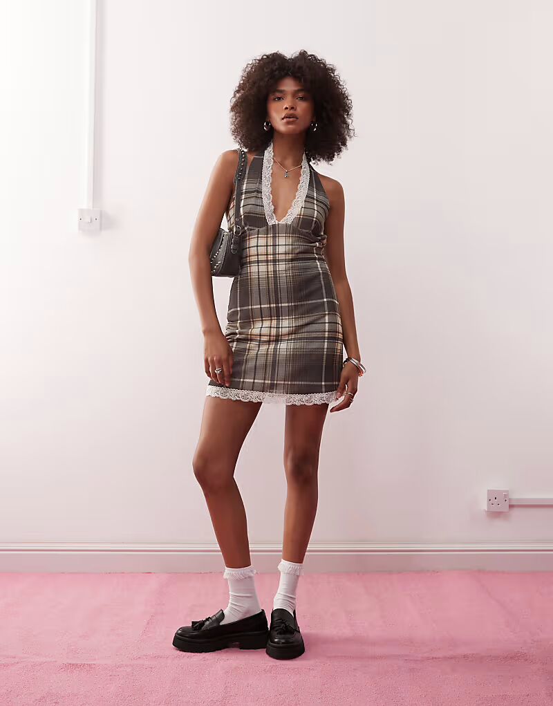 Мини-платье в клетку и кружево бежевого цвета Collusion