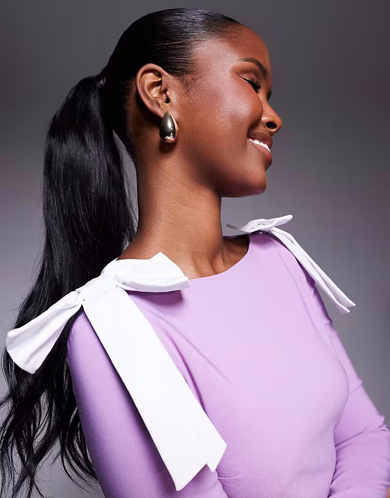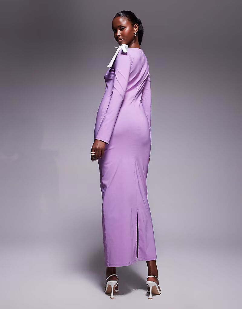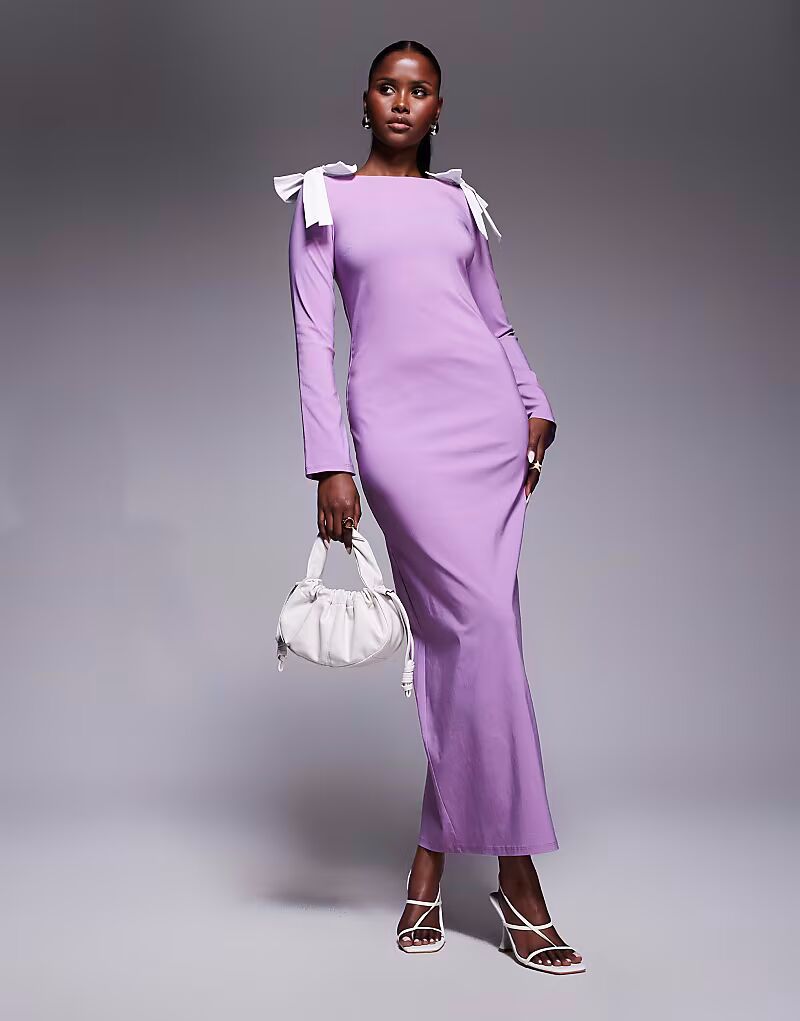 Платье макси с бантом на плече в сиреневом и белом цветах Daska