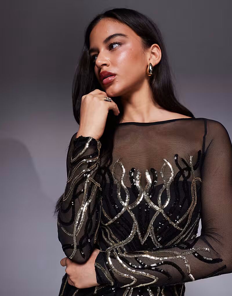 Платье-макси с длинным рукавом, блестками Goddiva, золотой
