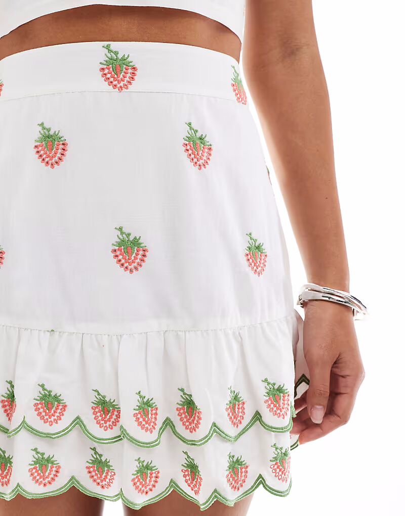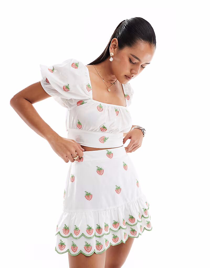 Мини-юбка с вышитым рисунком клубники белого цвета New Look