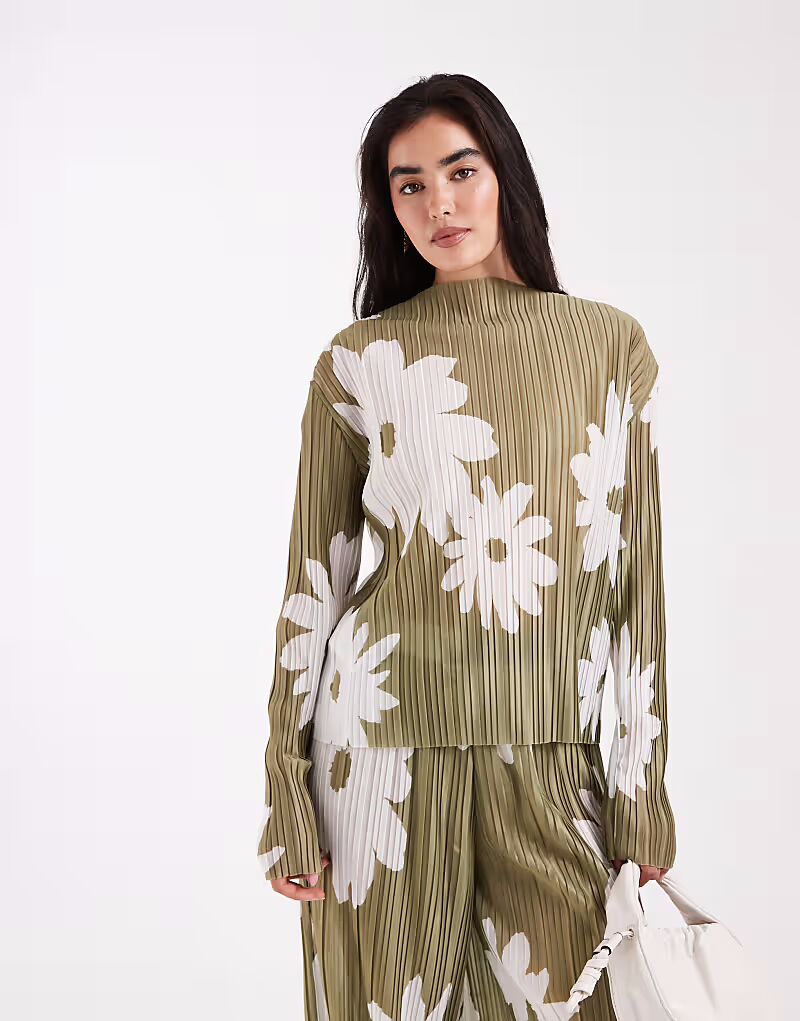 Топ с длинными рукавами из плиссе с оливковым цветочным принтом Object