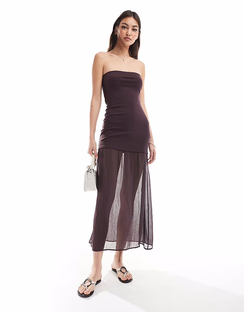 Платье-бандо макси с драпированным подолом бордового цвета Pull&Bear