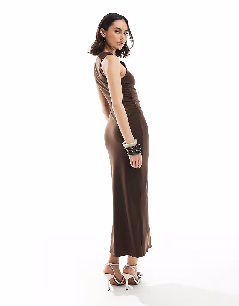 Длинное платье с узлом на плечах коричневого цвета Pull&Bear