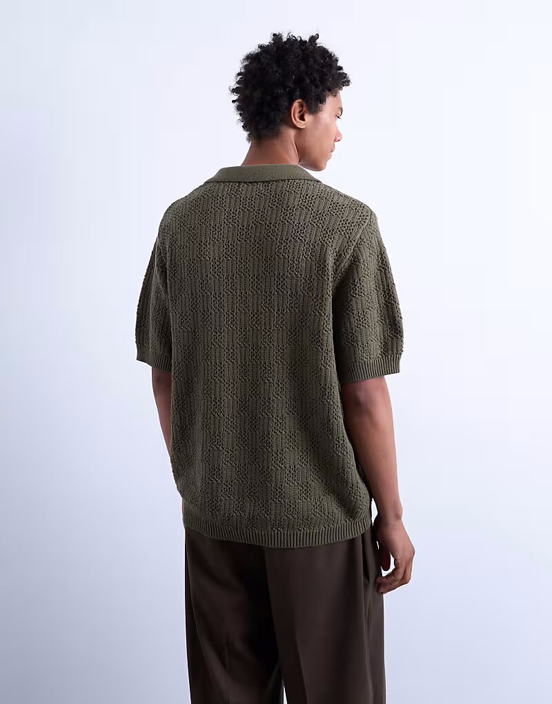Эта рубашка-поло связана крючком в клетку. Имеет отложной воротник, короткие рукава, ребристую отделку и классический крой.