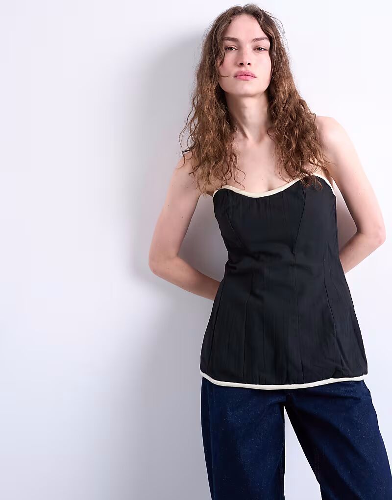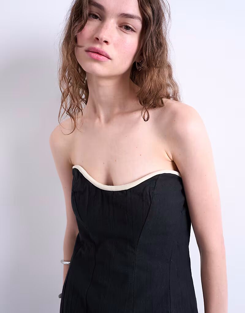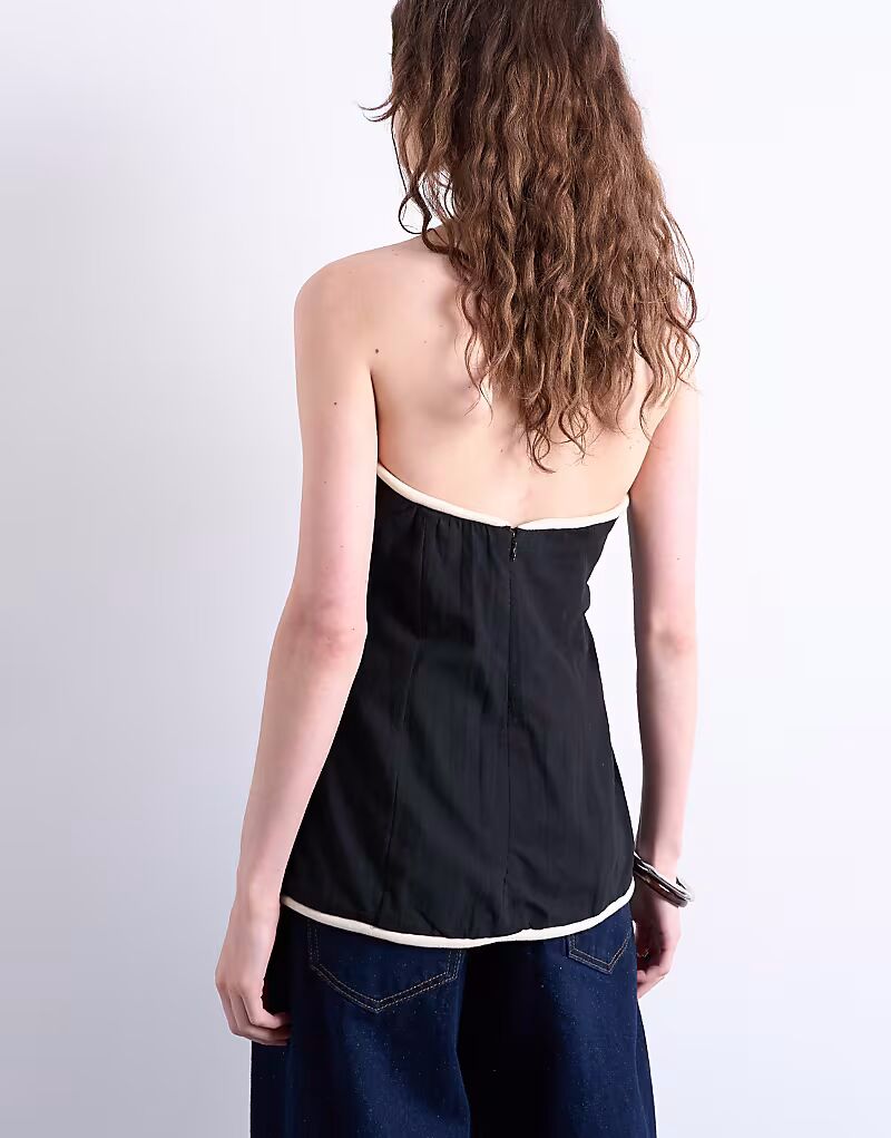 Этот топ-бандо без бретелек с вырезом сердечком, контрастной отделкой и застежкой-молнией сзади. Он облегающего кроя выполнен из лёгкой ткани.