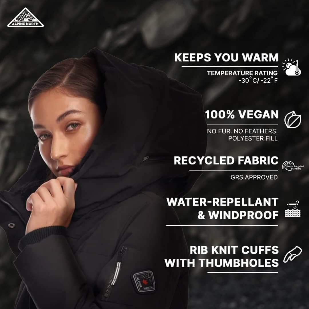 Женская веганская пуховая парка средней длины с капюшоном. Ветрозащитная, водостойкая, утепленная, красиво сидящая по фигуре. Благодаря веганской изоляции, защите от низких температур и многослойной посадке вы получите настоящую защиту от снега, слякоти, влажного холода и резкого ветра без ущерба для моды.